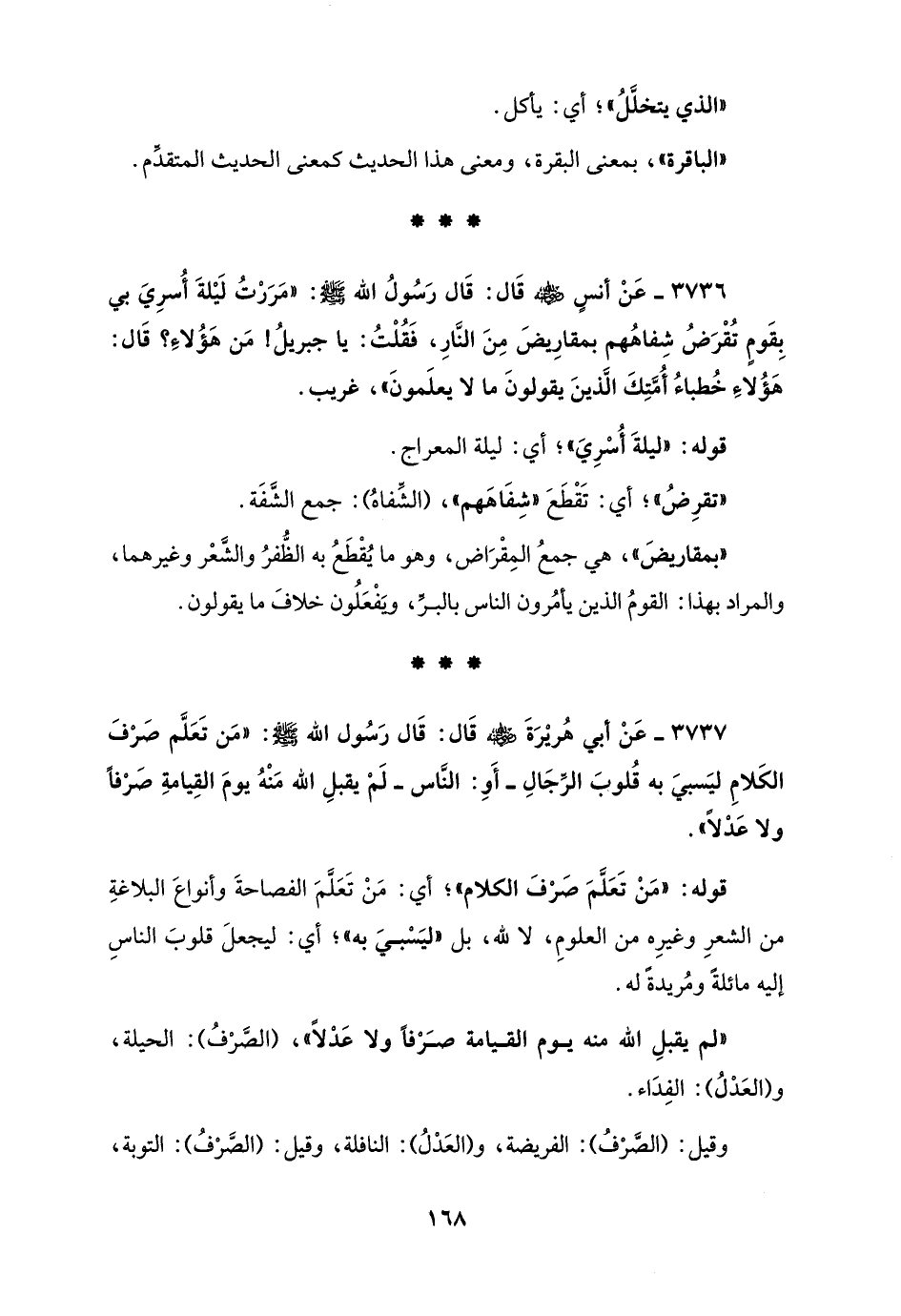 3737 - عَنْ أبي هُريْرَةَ - رضي الله عنه - قَال: قَال رَسُول الله - صلى الله عليه وسلم -: "مَن تَعَلَّم صَرْفَ الكَلامِ ليَسبيَ به قُلوبَ الرِّجَالِ - أَوِ: النَّاس - لَمْ يقبلِ الله مَنْهُ يومَ القِيامةِ صَرْفًا ولا عَدْلاً".
