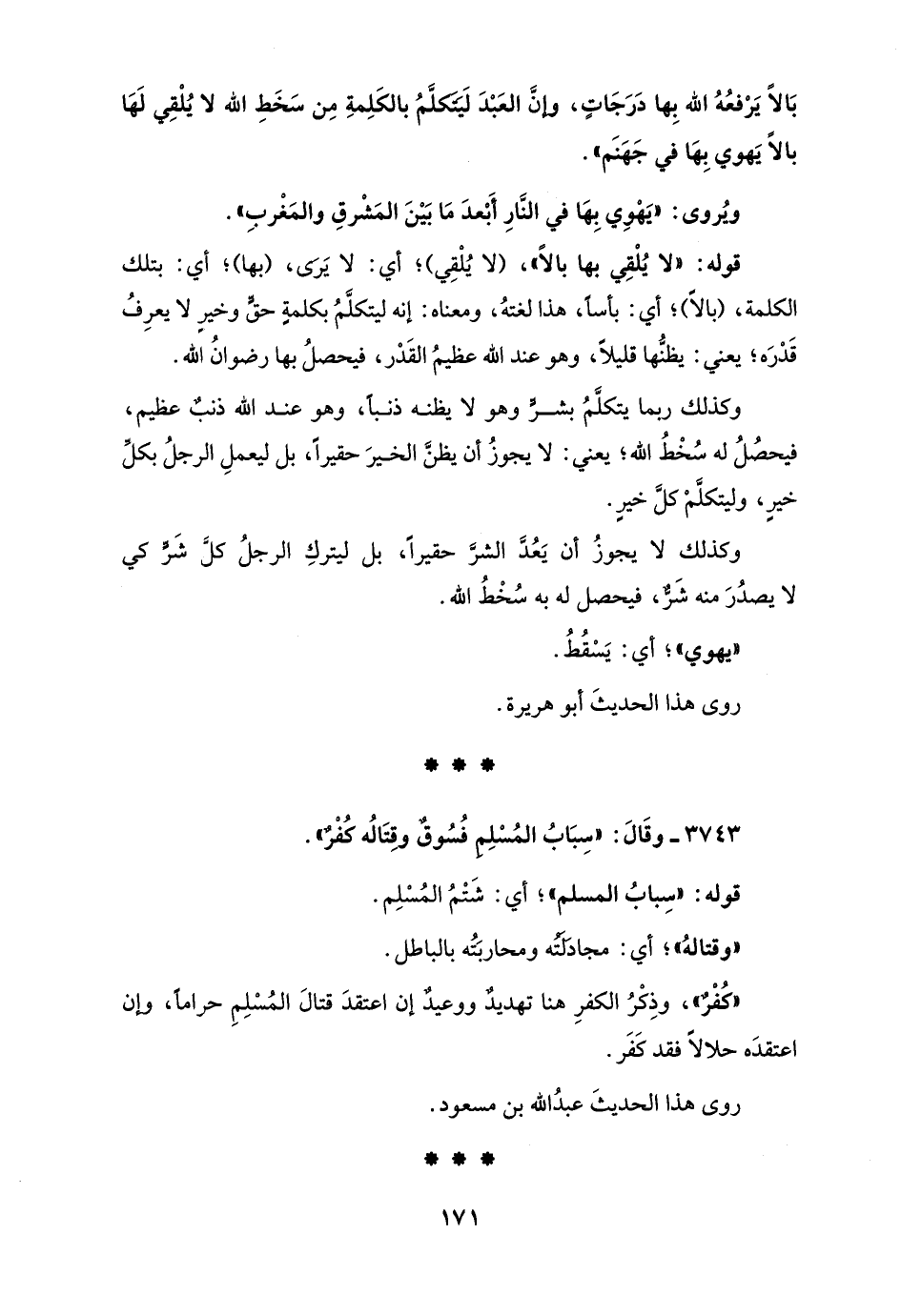 وكذلك ربما يتكلَّمُ بشرًّ وهو لا يظنه ذنبًا، وهو عند الله ذنبٌ عظيم، فيحصُلُ له سُخْطُ الله؛ يعني: لا يجوزُ أن يظنَّ الخيرَ حقيرًا، بل ليعملِ الرجلُ بكلِّ خيرٍ، وليتكلَّمْ كلَّ خيرٍ.
