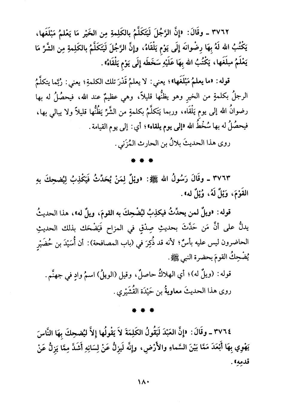 3763 - وقَالَ رَسُولُ الله - صلى الله عليه وسلم -: "ويْلٌ لِمَنْ يُحَدِّثُ فَيَكْذِبُ لِيُضحِكَ بهِ القَوْمَ، وَيْلٌ لَهُ، وُيْلٌ له".
