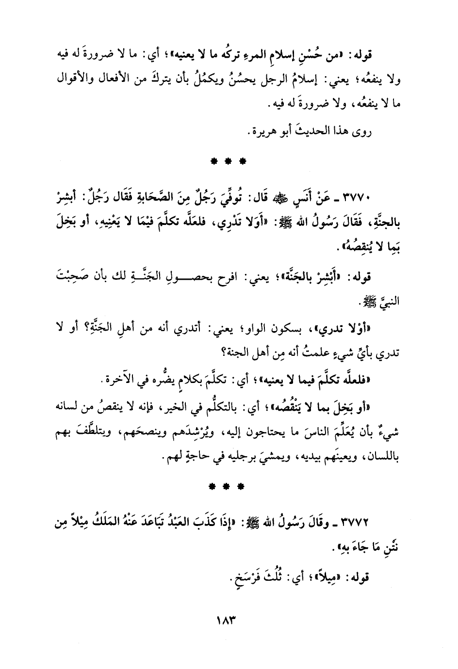 3770 - عَنْ أَنَسٍ - رضي الله عنه - قَال: تُوفِّيَ رَجُلٌ مِنَ الصَّحَابةِ فَقَال رَجُلٌ: أبشِرْ بالجنَّةِ، فَقَالَ رَسُولُ الله - صلى الله عليه وسلم -: "أَوَلا تَدْرِي، فلعَلَّه تكلَّمَ فيْمَا لا يَعْنِيهِ، أو بَخِلَ بِمَا لا يُنقِصُهُ".