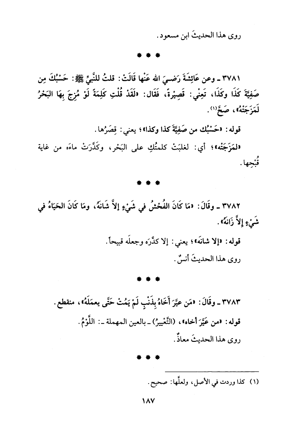 3781 - وعن عَائِشَةَ رَضيَ الله عَنْها قَالَتْ: قلتُ للنَّبيِّ - صلى الله عليه وسلم -: حَسْبُكَ مِن صَفِيَّةَ كَذَا وكَذَا، تَعِنْي: قَصِيْرةً، فَقَال: "لَقَدْ قُلْتِ كَلِمَةً لَوْ مُزِجَ بِهَا البَحْرُ لَمَزَجَتْهُ"، صَحَّ (¬1).
