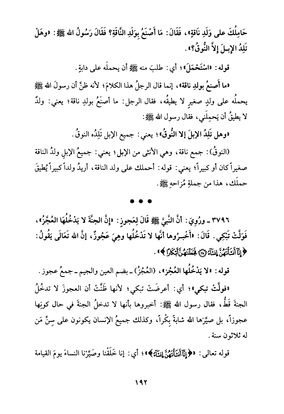 3796 - ورُوِيَ: أنَّ النَّبيَّ - صلى الله عليه وسلم - قَالَ لِعَجوزٍ: "إنَّ الجنَّةَ لا يَدْخُلُهَا العُجَّزُ"، فَوَلَّتْ تَبْكِي. قَالَ: "أَخْبرُوها أنَّها لا تَدْخُلُها وَّهَيَ عَجُوزٌ، إنَّ الله تَعَالَى يَقُولُ: {إِنَّا أَنْشَأْنَاهُنَّ إِنْشَاءً (35) فَجَعَلْنَاهُنَّ أَبْكَارً} ".