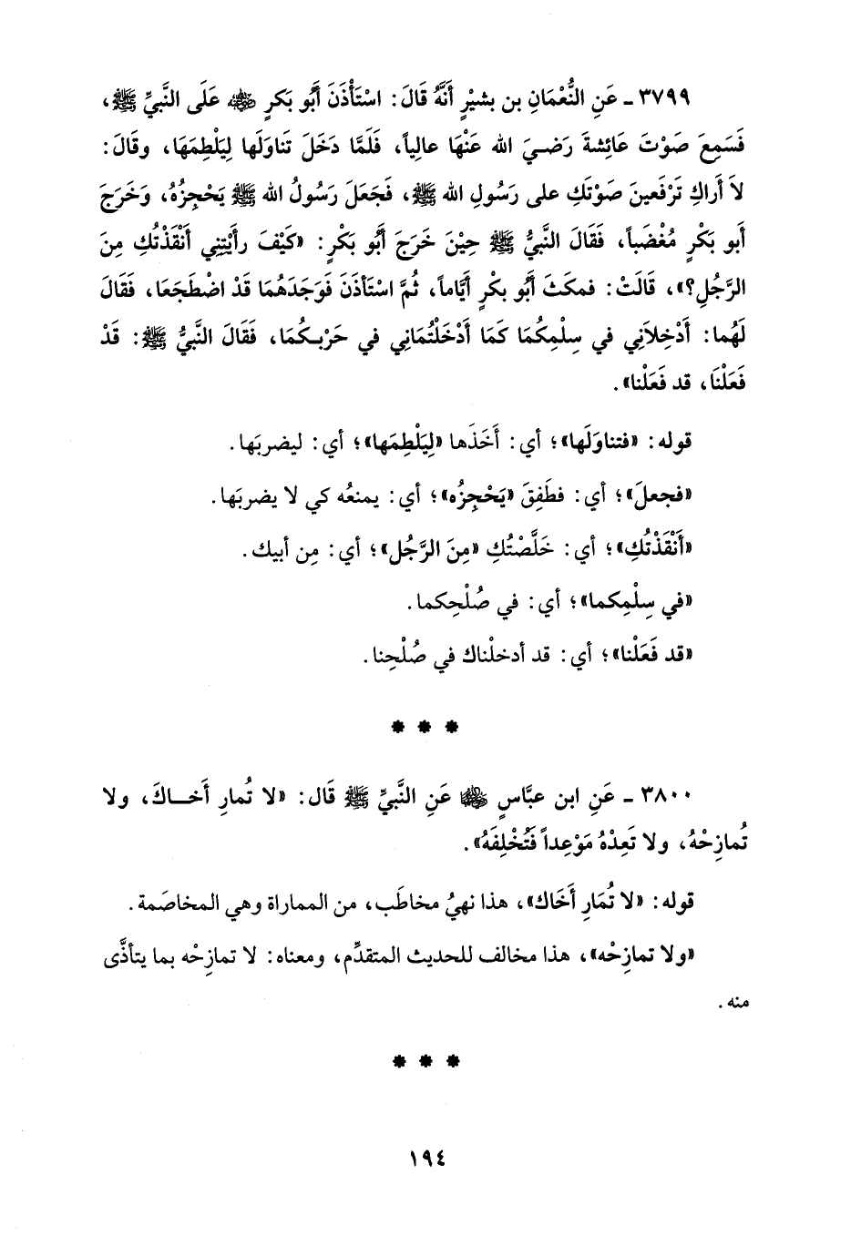 3799 - عَنِ النُّعْمَانِ بن بشيْرٍ أَنَّهُ قَالَ: اسْتَأْذَنَ أَبُو بَكرٍ - رضي الله عنه - عَلَى النَّبيِّ - صلى الله عليه وسلم -، فَسَمِعَ صَوْتَ عَائِشةَ رَضيَ الله عَنْهَا عالِيًا، فَلَمَّا دَخَلَ تَناوَلَها لِيَلْطِمَهَا، وقَالَ: لاَ أَراكِ تَرْفَعينَ صَوْتَكِ على رَسُولِ الله - صلى الله عليه وسلم -، فَجَعَلَ رَسُولُ الله - صلى الله عليه وسلم - يَحْجِزُهُ، وَخَرَجَ أَبو بَكْرٍ مُغْضَبًا، فَقَالَ النَّبيُّ - صلى الله عليه وسلم - حِيْنَ خَرَجَ أَبُو بَكْرٍ: "كَيْفَ رأَيْتَنِي أَنْقَذْتُكِ مِنَ الرَّجُلِ؟ "، قَالَتْ: فمكَثَ أَبُو بكْرٍ أَيَّامًا، ثُمَّ اسْتَأذَنَ فَوَجَدَهُمَا قَدْ اضْطَجَعَا، فَقَالَ لَهُما: أَدْخِلاَنِي في سِلْمِكُمَا كَمَا أَدْخَلْتُمَانِي في حَرْبكُمَا، فَقَالَ النَّبيُّ - صلى الله عليه وسلم -: قَدْ فَعَلْنَا، قد فَعَلْنا".