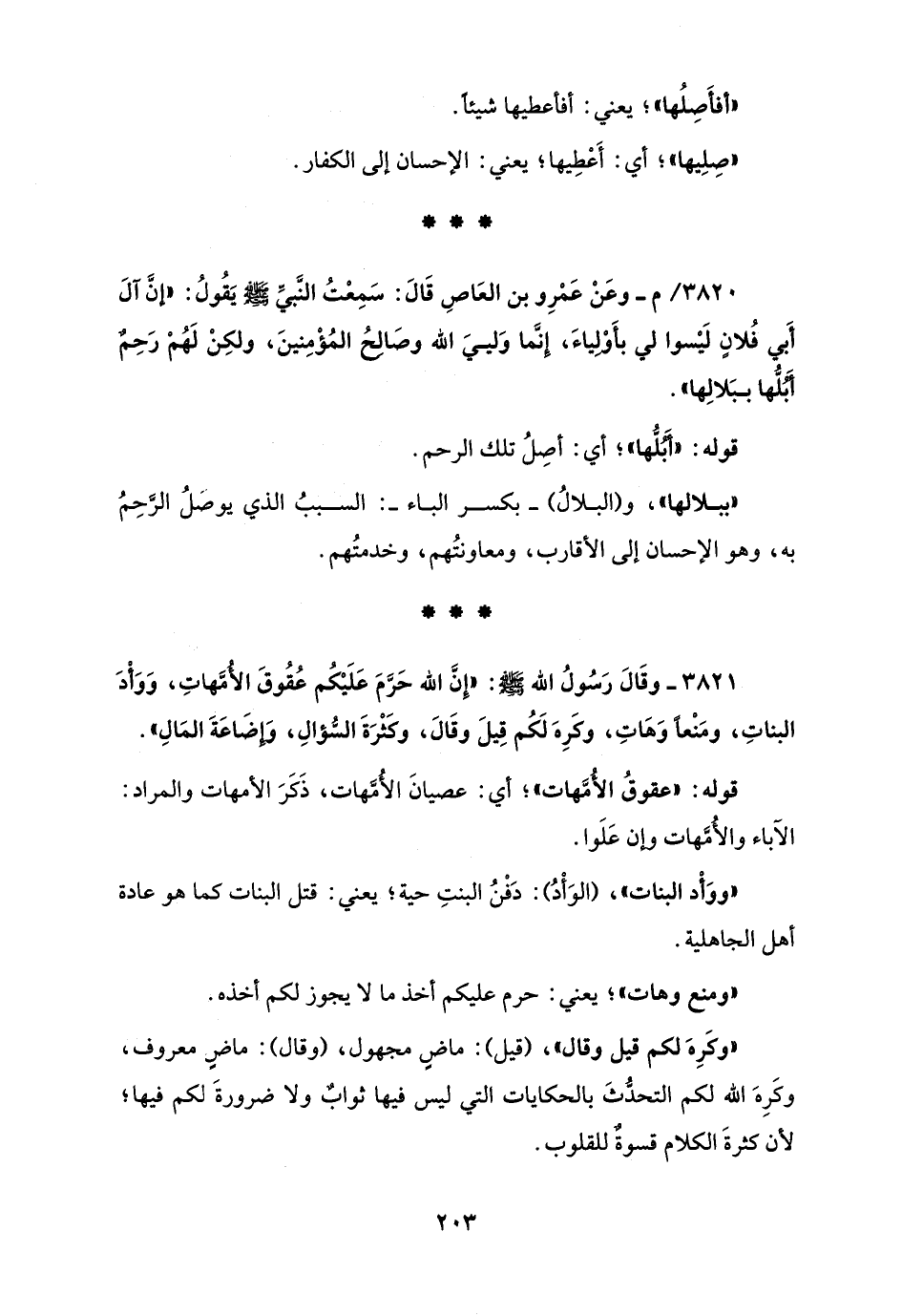 3820/ م - وعَنْ عَمْرِو بن العَاصِ قَالَ: سَمِعْتُ النَّبيِّ - صلى الله عليه وسلم - يَقُولُ: "إنَّ آلَ أَبِي فُلانٍ لَيْسوا لي بأَوْلِياءَ، إنَّما وَلييَ الله وصَالِحُ المُؤْمِنينَ، ولكِنْ لَهُمْ رَحِمٌ أَبُلُّها ببَلالِها".