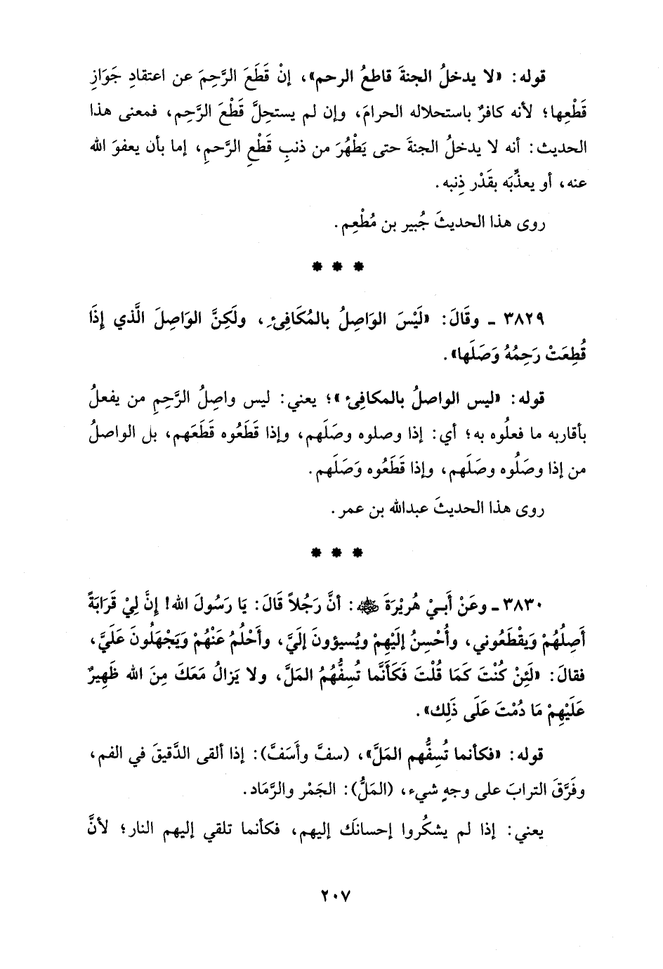 3830 - وعَنْ أَبيْ هُريْرَةَ - رضي الله عنه -: أنَّ رَجُلًا قَالَ: يَا رَسُولَ الله! إِن لِيْ قَرَابَةً أَصِلُهُمْ وَيقْطَعُوني، وأُحْسِنُ إلَيْهِمْ ويُسيؤونَ إلَيَّ، وأَحْلُمُ عَنْهُمْ وَيَجْهَلُونَ عَلَيَّ، فقالَ: "لَئِنْ كُنْتَ كَمَا قُلْتَ فَكَأَنَّما تُسِفُّهمُ المَلَّ، ولا يَزالُ مَعَكَ مِنَ الله ظَهِيرٌ عَلَيْهِمْ مَا دُمْتَ عَلَى ذَلِك".