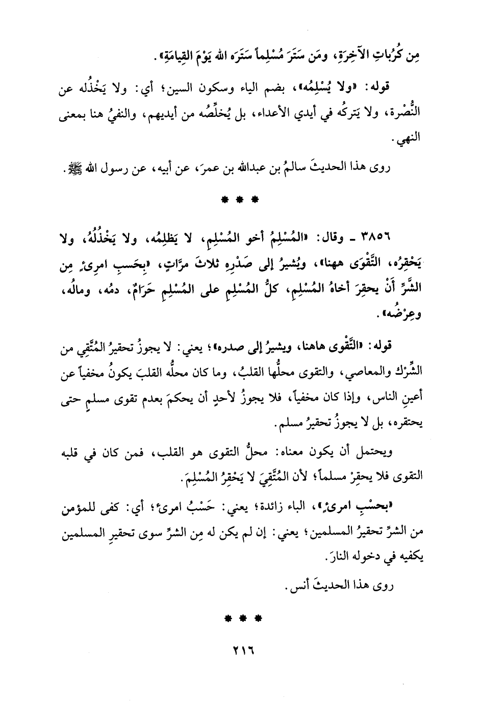 3856 - وقال: "المُسْلِمُ أخو المُسْلِم، لا يَظلِمُه، ولا يَخْذُلُهُ، ولا يَحْقِرُه، التَّقْوَى ههنا"، ويُشيرُ إلى صَدْرِهِ ثلاثَ مرَّاتٍ، "بِحَسبِ امرِئٍ مِن الشَّرِّ أَنْ يحقِرَ أخاهُ المُسْلِمِ، كلُّ المُسْلِمِ على المُسْلِمِ حَرَامٌ، دمُه، ومالُه، وعِرْضُه".