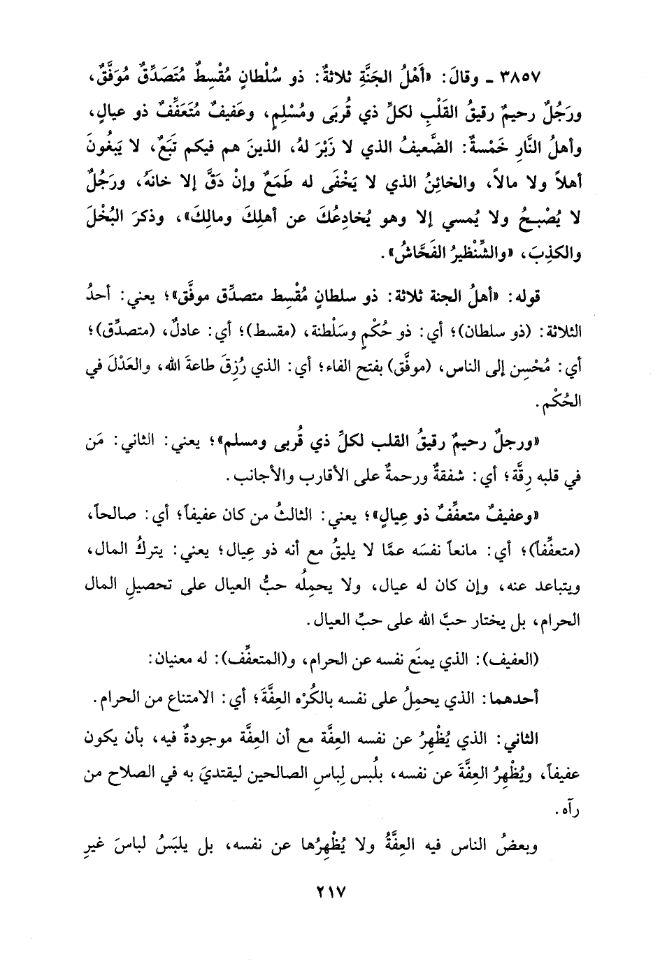 قوله: "أهلُ الجنة ثلاثة: ذو سلطانٍ مُقْسِط متصدِّق موفَّق"؛ يعني: أحدُ الثلاثة: (ذو سلطان)؛ أي: ذو حُكْمٍ وسَلْطنة، (مقسط)؛ أي: عادلٌ، (متصدِّق)؛ أي: مُحْسِن إلى الناس، (موفَّق) بفتح الفاء؛ أي: الذي رُزِقَ طاعةَ الله، والعَدْلَ في الحُكْم.