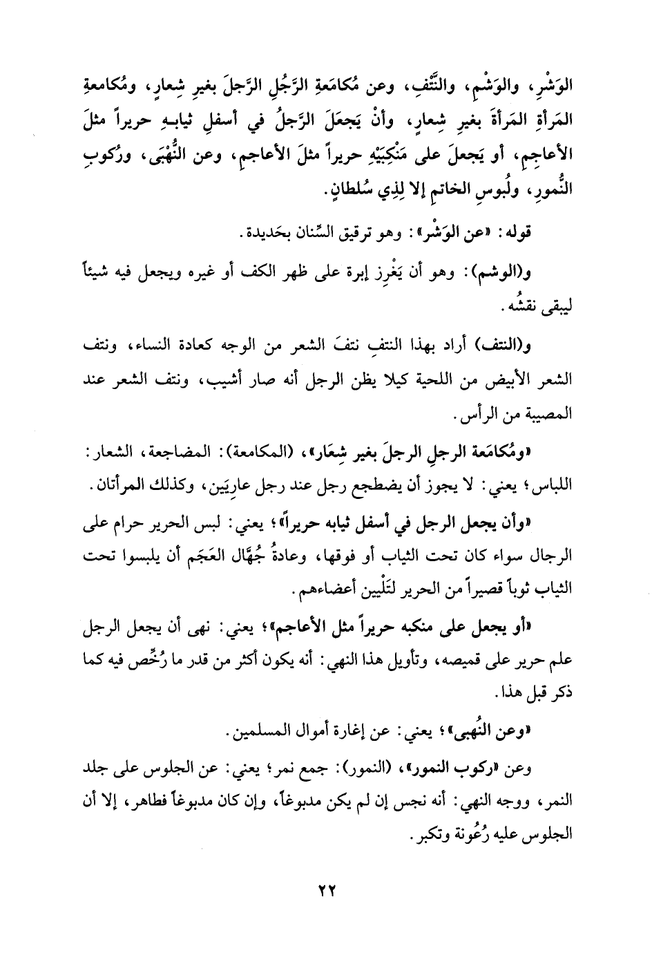 الوَشْرِ، والوَشْمِ، والنَّتْفِ، وعن مُكامَعةِ الرَّجُلِ الرَّجلَ بغيرِ شِعارٍ، ومُكامعةِ المَرأةِ المَرأةَ بغيرِ شِعارٍ، وأنْ يَجعَلَ الرَّجلُ في أسفلِ ثيابهِ حريرًا مثلَ الأعاجِمِ، أو يَجعلَ على مَنْكِبَيْهِ حريرًا مثلَ الأعاجمِ، وعن النُّهْبَى، ورُكوبِ النُّمورِ، ولُبوسِ الخاتم إلا لِذِي سُلطانٍ.