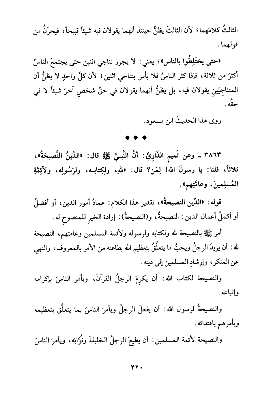 3863 - وعن تَميمٍ الدَّارِيِّ: أنَّ النَّبيَّ - صلى الله عليه وسلم - قال: "الدِّينُ النَّصيحَةُ"، ثلاثًا، قلنا: يا رسولَ الله! لِمَن؟ قال: "للهِ، ولِكِتابه، ولرَسُولِه، ولأئِمَّةِ المُسلِمينَ، وعامَّتِهم".