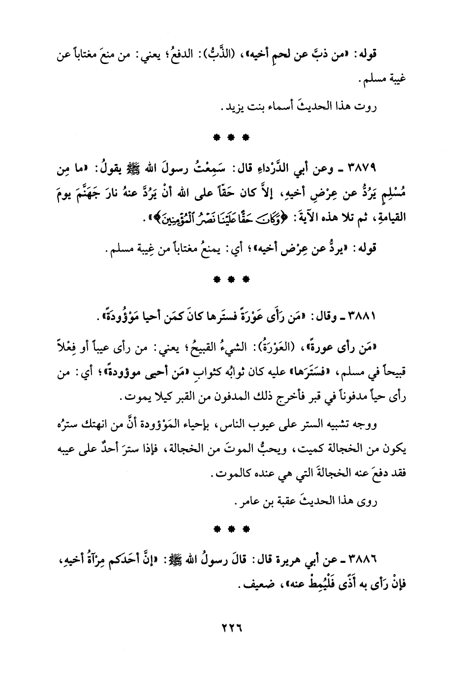 3879 - وعن أبي الدَّرْداءِ قال: سَمِعْتُ رسولَ الله - صلى الله عليه وسلم - يقولُ: "ما مِن مُسْلِمٍ يَرُدُّ عن عِرْضِ أخيهِ، إلاَّ كان حَقًّا على الله أنْ يَرُدَّ عنهُ نارَ جَهَنَّمَ يومَ القيامةِ، ثم تلا هذه الآيةَ: {وَكَانَ حَقًّا عَلَيْنَا نَصْرُ الْمُؤْمِنِينَ} ".
