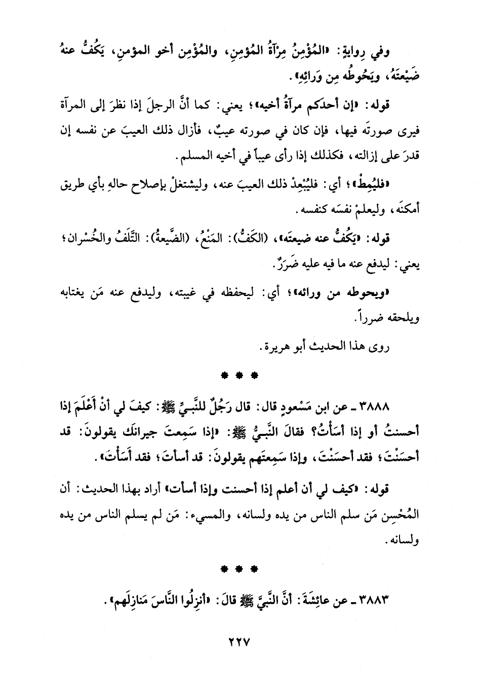 وفي رِوايةٍ: "المُؤْمِنُ مِرْآةُ المُؤمِنِ، والمُؤْمِن أخو المؤمنِ، يَكُفُّ عنهُ ضَيْعتَهُ، ويَحُوطُه مِن وَرائِهِ".