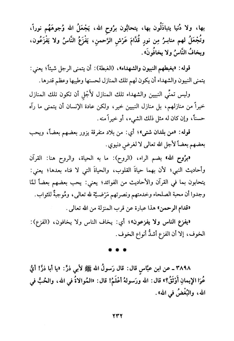 3898 - عن ابن عبَّاسٍ قال: قال رَسولُ الله - صلى الله عليه وسلم - لأبي ذرٍّ: "يا أبا ذرًّ! أيُّ عُرَا الإيمانِ أَوْثَقُ؟ " قال: الله ورَسولهُ أعْلَمُ! قال: "المُوالاةُ في الله، والحُبُّ في الله، والبُغْضُ في الله".