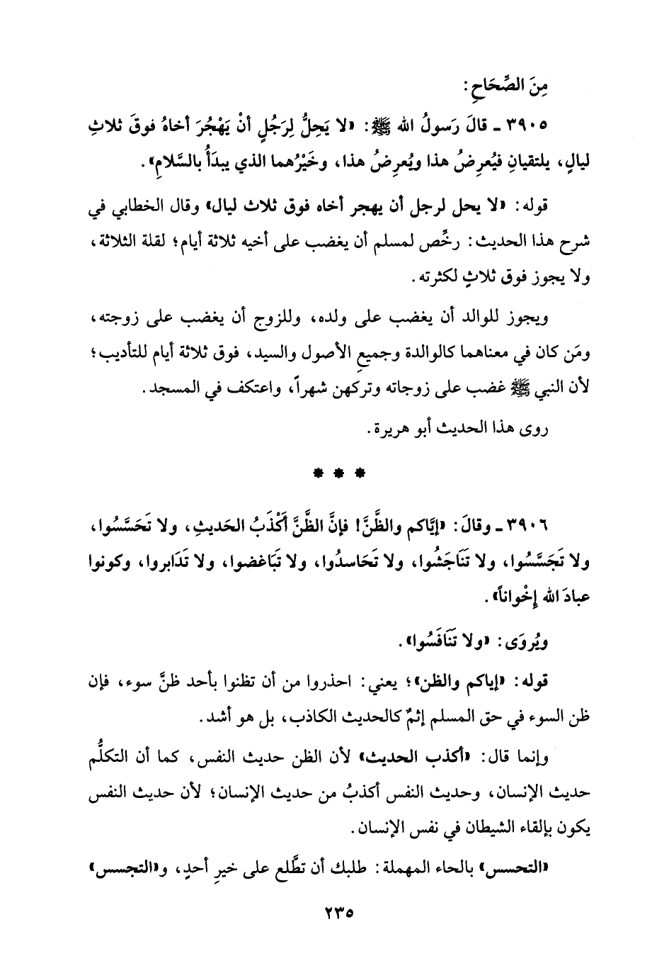 3905 - قالَ رَسولُ الله - صلى الله عليه وسلم -: "لا يَحِلُّ لِرَجُلٍ أنْ يَهْجُرَ أخاهُ فوقَ ثلاثِ ليالٍ، يلتقيانِ فيُعرِضُ هذا ويُعرِضُ هذا، وخَيْرُهما الذي يبدَأُ بالسَّلامِ".