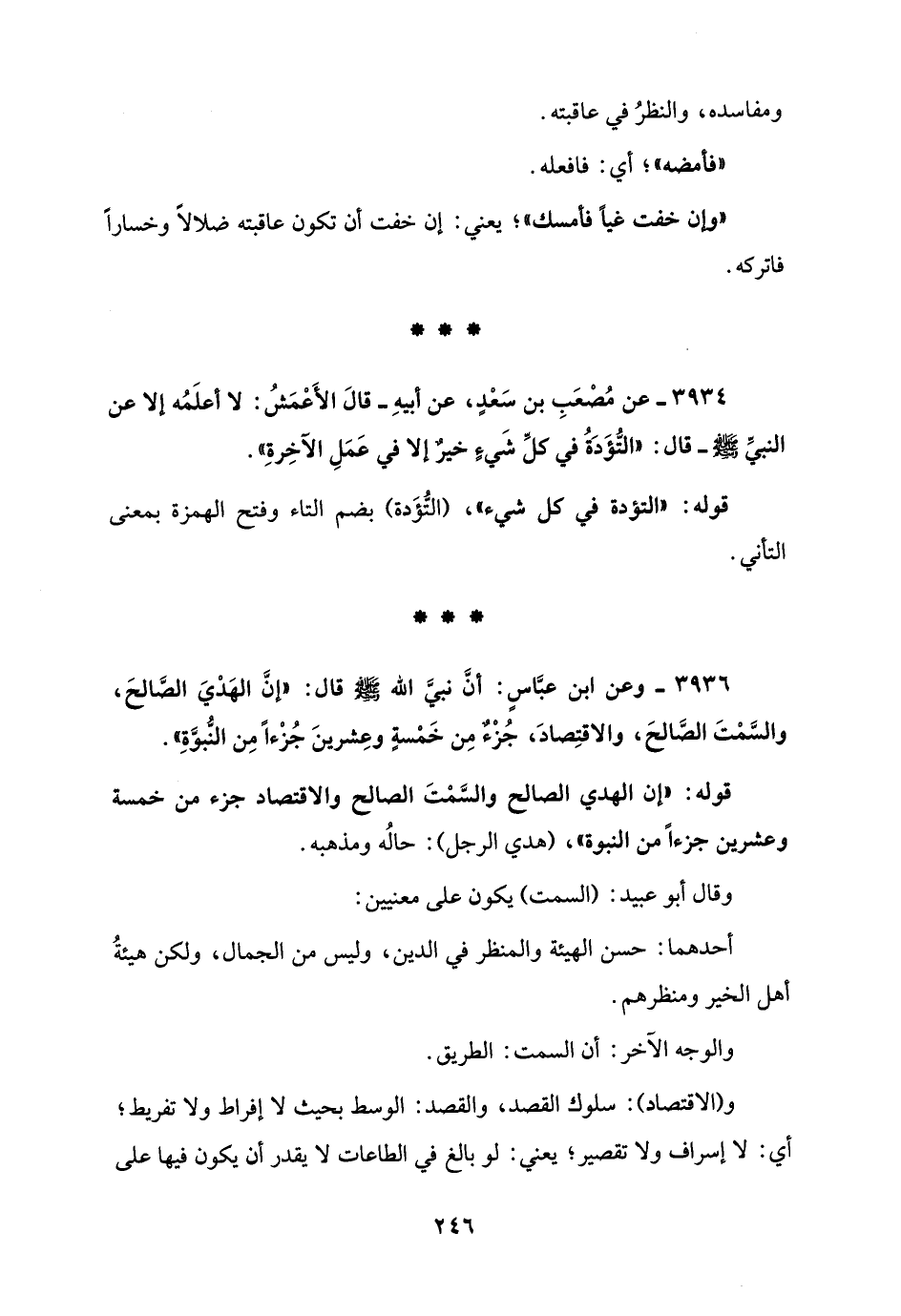 3934 - عن مُصْعَبِ بن سَعْدٍ، عن أبيهِ - قالَ الأَعْمَشُ: لا أعلَمُه إلا عن النبيِّ - صلى الله عليه وسلم - قال: "التُّؤَدَةُ في كلِّ شَيءٍ خيرٌ إلا في عَمَلِ الآخِرةِ".