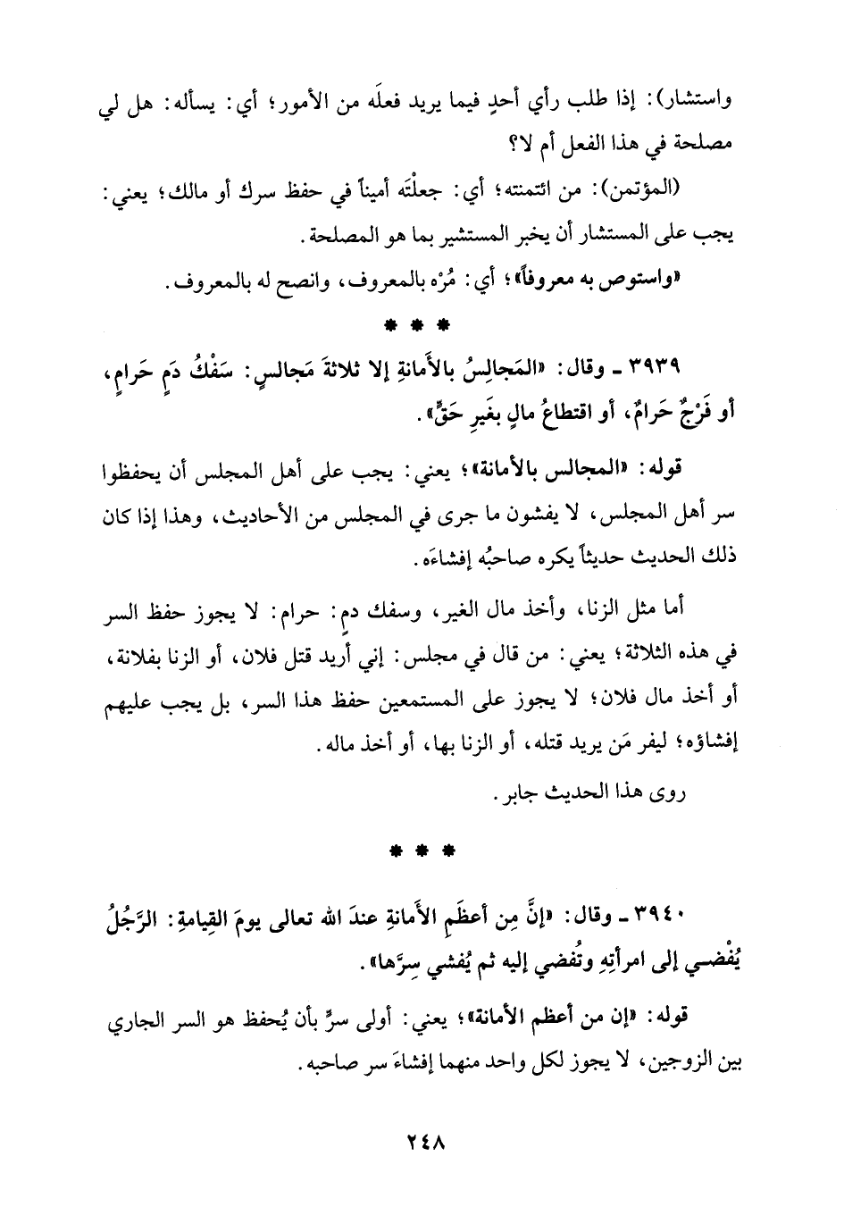 3939 - وقال: "المَجالِسُ بالأَمانةِ إلا ثلاثةَ مَجالسٍ: سَفْكُ دَمٍ حَرامٍ، أو فَرْجٌ حَرامٌ، أو اقتطاعُ مالٍ بغَيرِ حَقًّ".