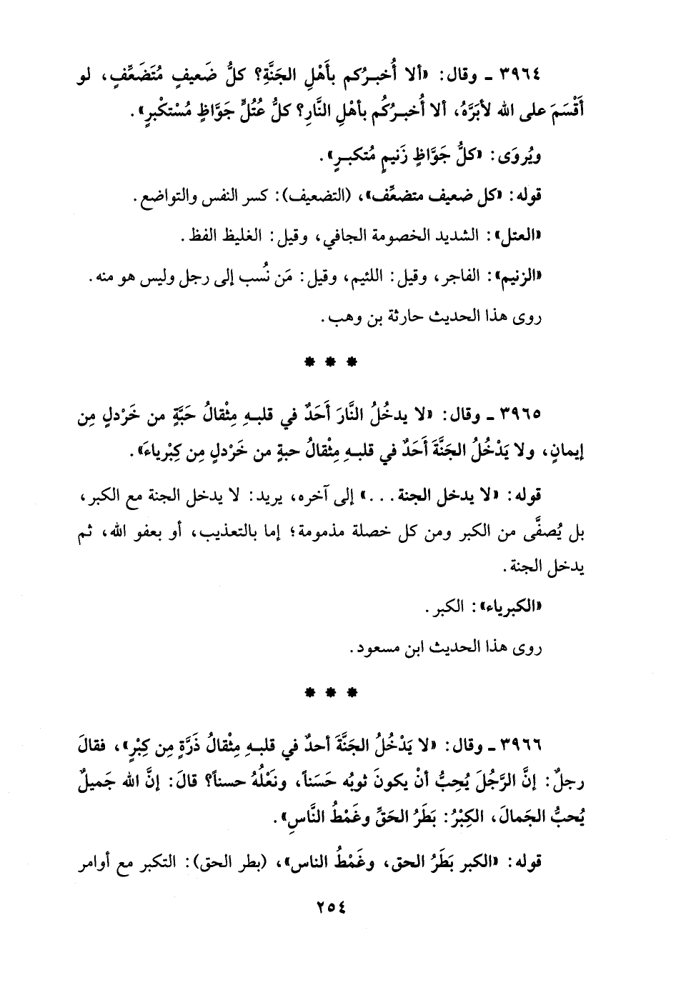 3965 - وقال: "لا يدخُلُ النَّارَ أَحَدٌ في قلبهِ مِثْقالُ حَبَّةٍ من خَرْدلٍ مِن إيمانٍ، ولا يَدْخُلُ الجَنَّةَ أَحَدٌ في قلبهِ مِثْقالُ حبةٍ من خَرْدلٍ مِن كِبْرياءَ".