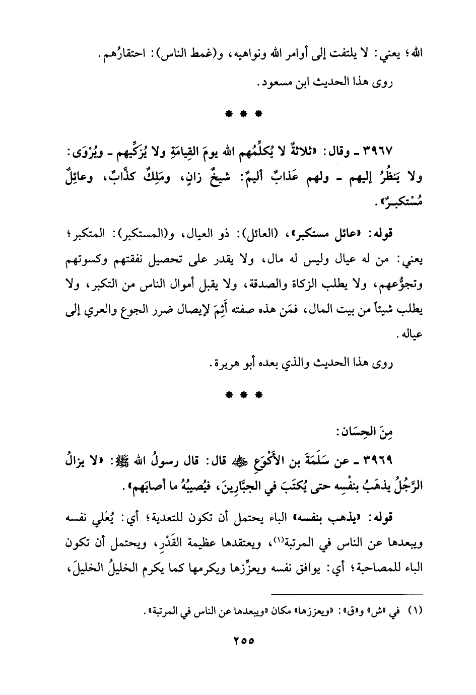 3967 - وقال: "ثلاثةٌ لا يُكلِّمُهم الله يومَ القِيامَةِ ولا يُزَكَّيهم - ويُرْوَى: ولا يَنظُرُ إليهم - ولهم عَذابٌ أليمٌ: شيخٌ زانٍ، ومَلِكٌ كذَّابٌ، وعائِلٌ مُسْتكبرٌ".