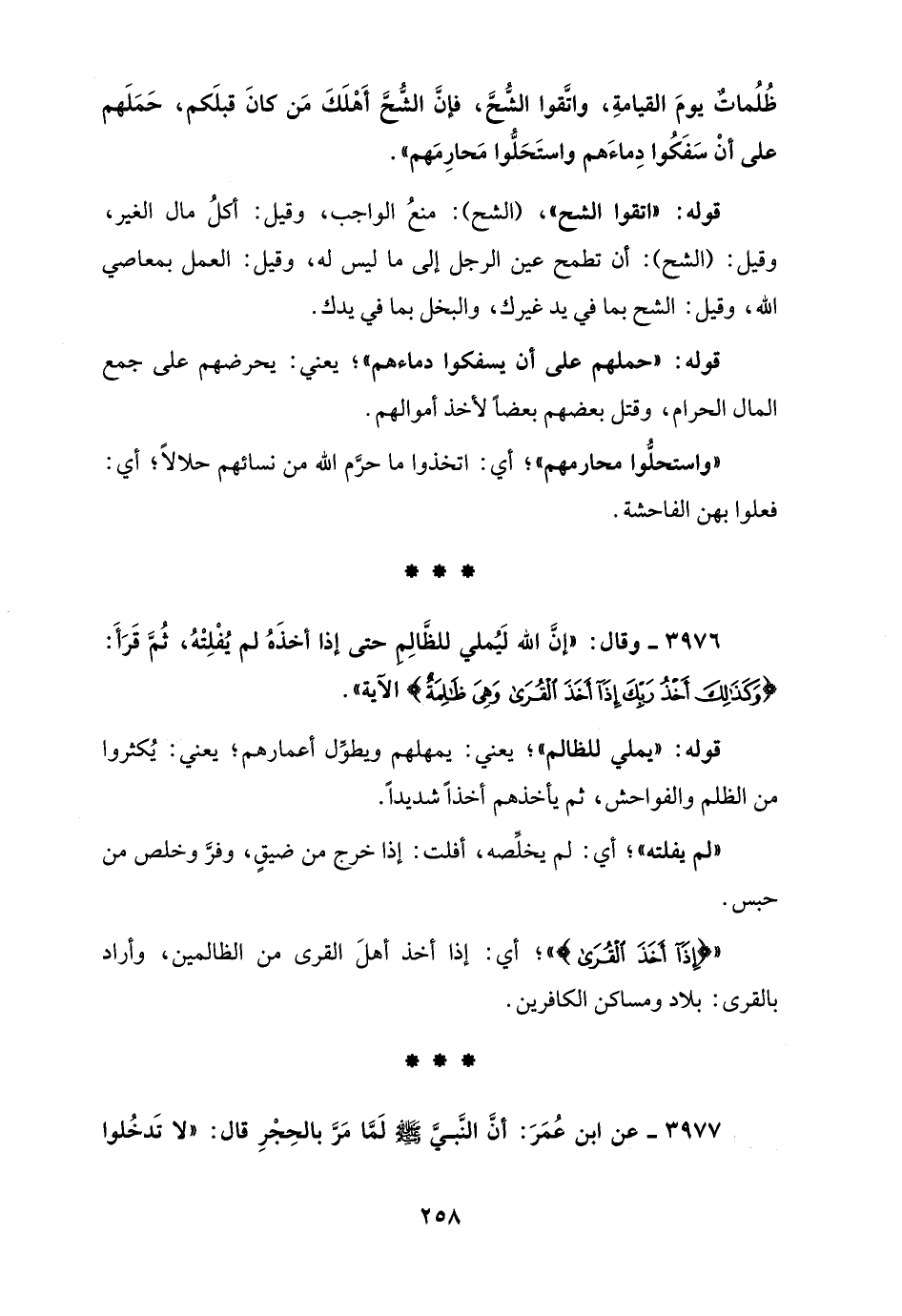 ظُلُماتٌ يومَ القيامةِ، واتَّقوا الشُّحَّ، فإنَّ الشُّحَّ أَهْلَكَ مَن كانَ قبلَكم، حَمَلَهم على أنْ سَفَكُوا دِماءَهم واستَحَلُّوا مَحارِمَهم".