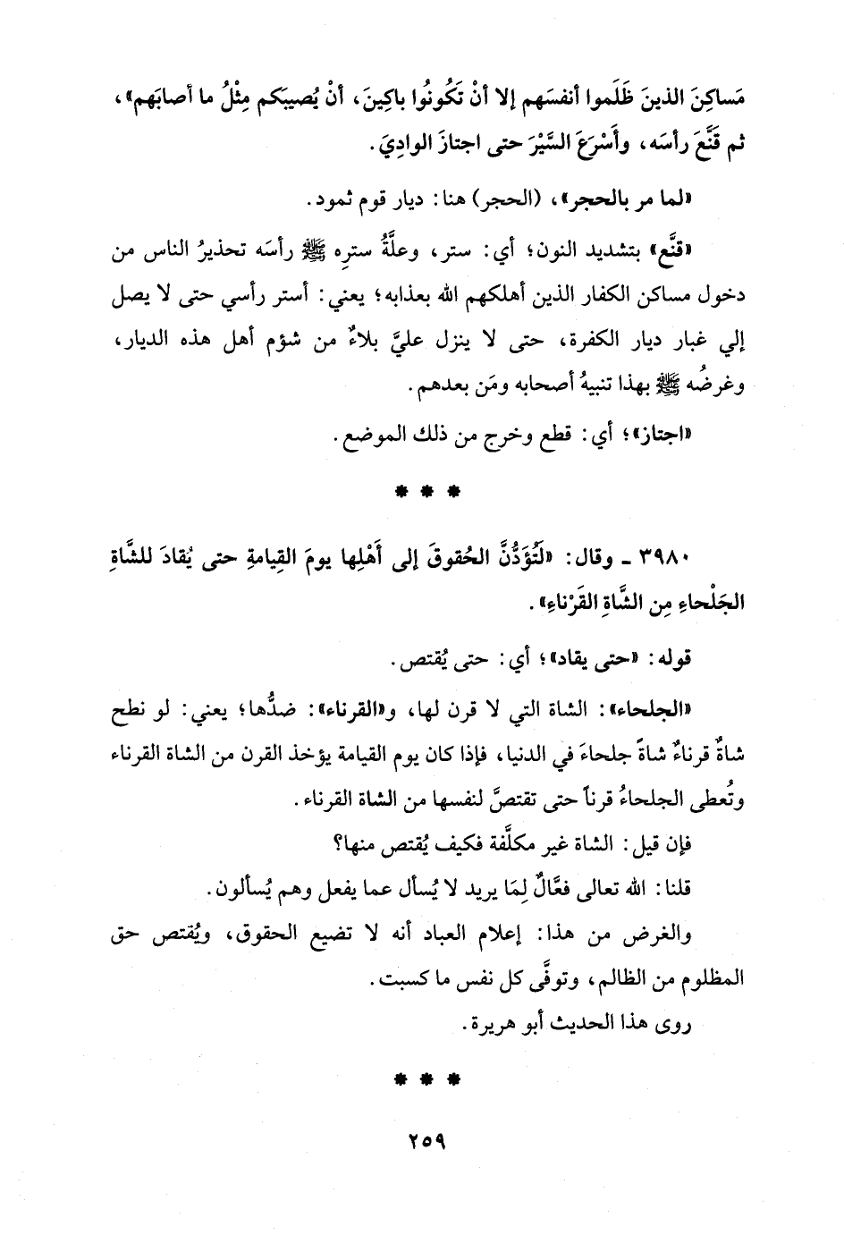 3980 - وقال: "لَتُؤَدُّنَّ الحُقوقَ إلى أَهْلِها يومَ القِيامةِ حتى يُقادَ للشَّاةِ الجَلْحاءِ مِن الشَّاةِ القَرْناءِ".