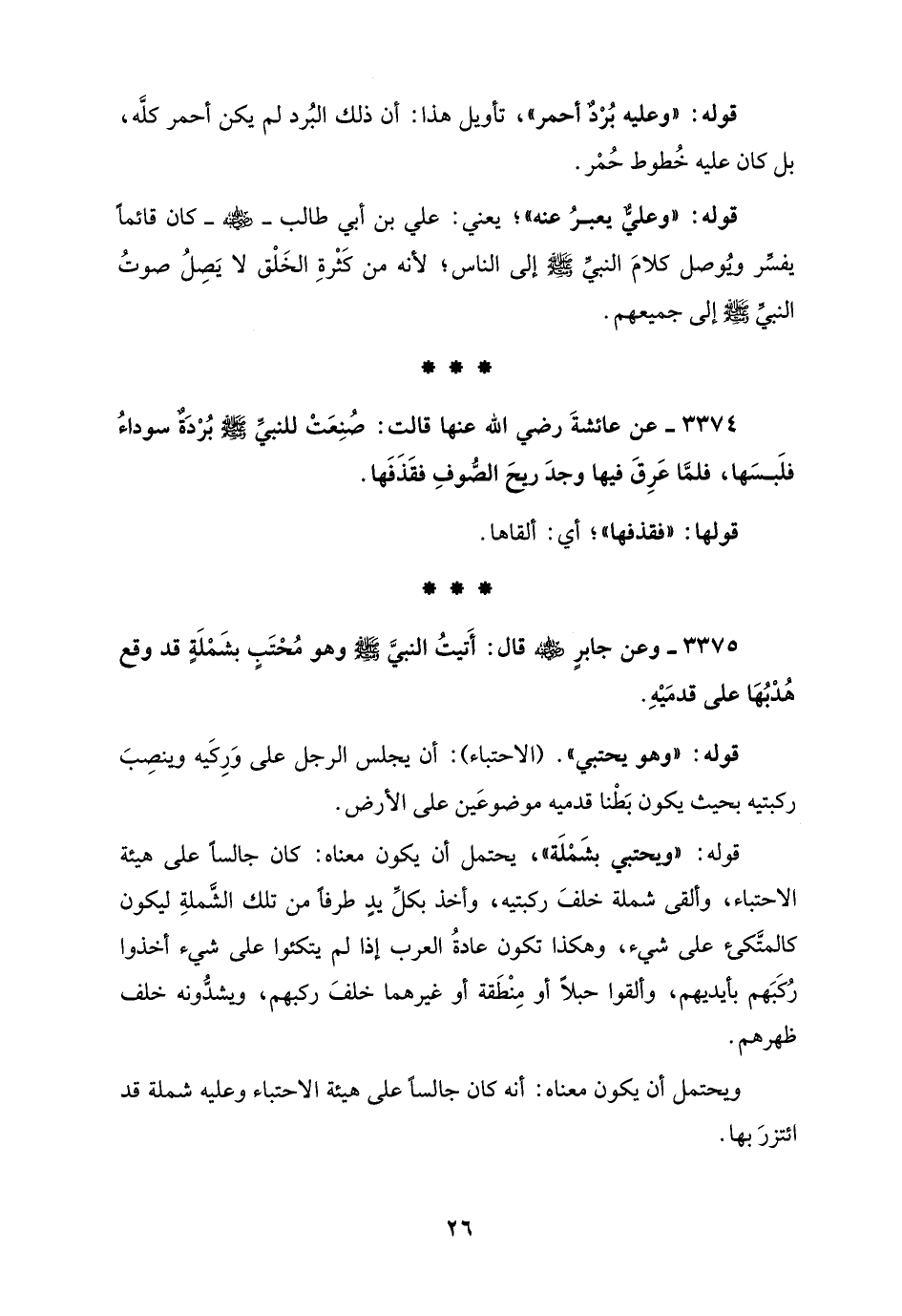 3375 - وعن جابرٍ - رضي الله عنه - قال: أَتيتُ النبيَّ - صلى الله عليه وسلم - وهو مُحْتَبٍ بشَمْلَةٍ قد وقع هُدْبُهَا على قدمَيْهِ.