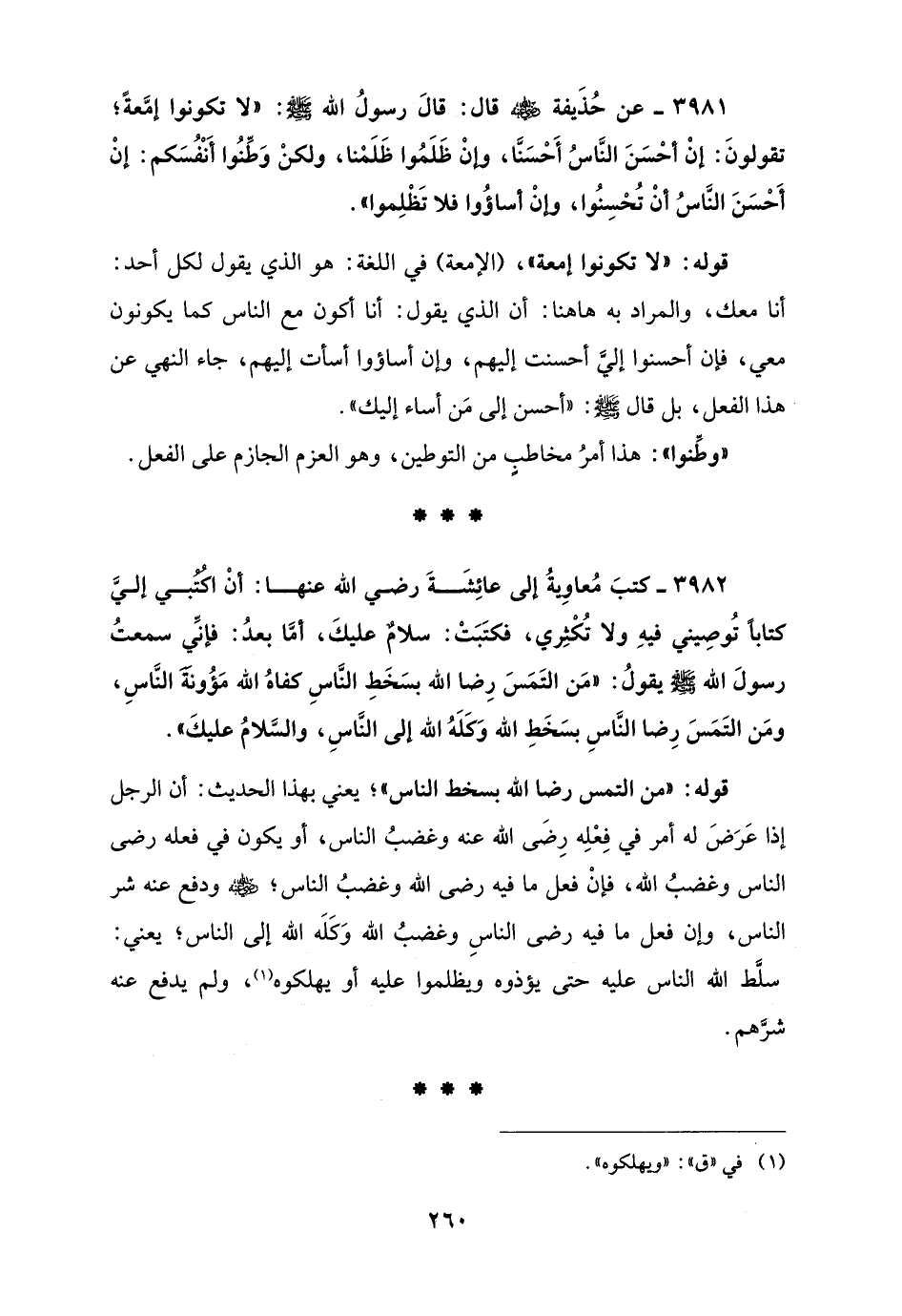 3981 - عن حُذَيفة - رضي الله عنه - قال: قالَ رسولُ الله - صلى الله عليه وسلم -: "لا تكونوا إمَّعةً؛ تقولونَ: إنْ أحْسَنَ النَّاسُ أَحْسَنَّا، وإنْ ظَلَمُوا ظَلَمْنا, ولكنْ وَطِّنُوا أَنْفُسَكم: إنْ أَحْسَنَ النَّاسُ أنْ تُحْسِنُوا، وإنْ أساؤُوا فلا تَظْلِموا".