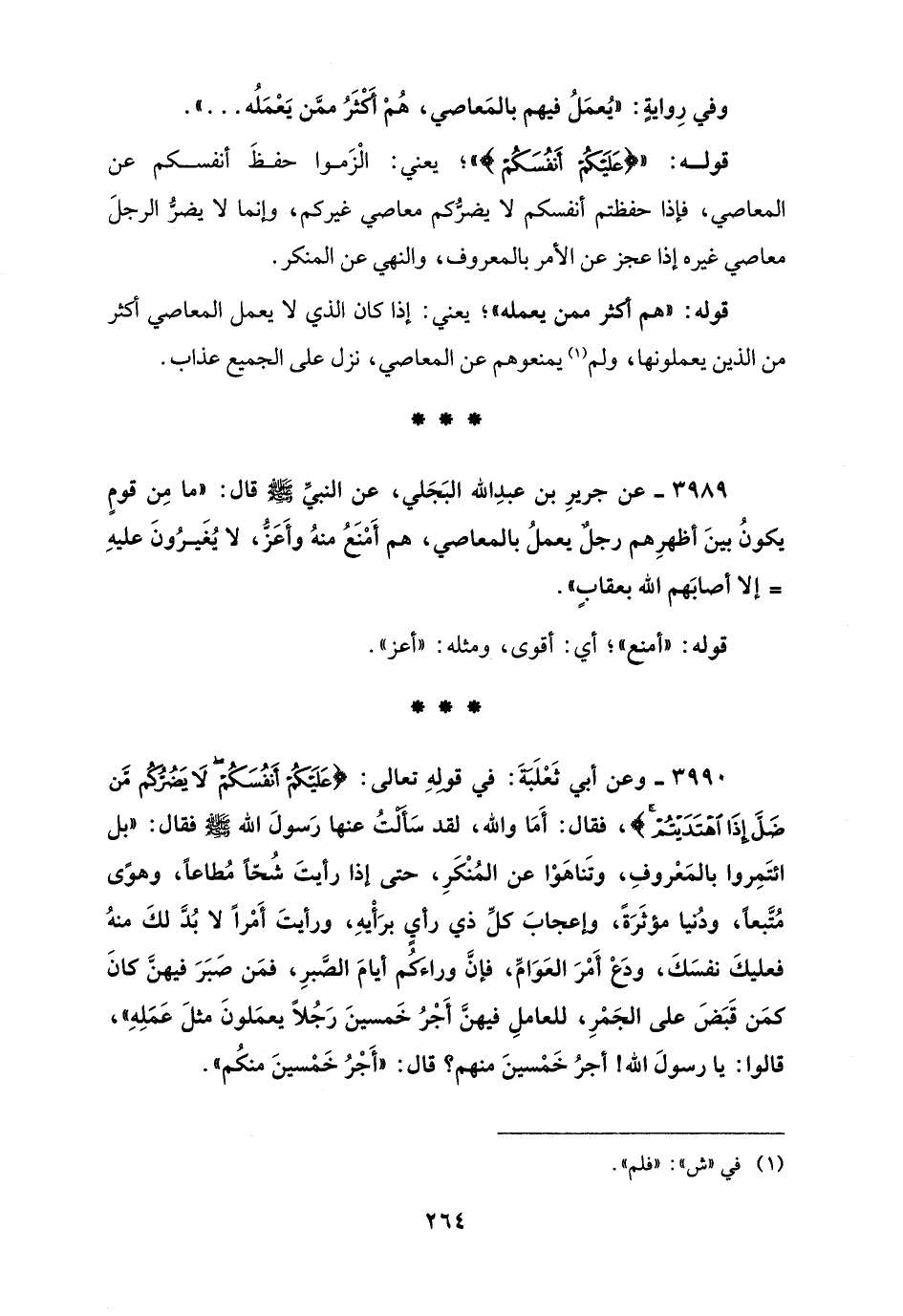 3989 - عن جريرِ بن عبدِ الله البَجَلي، عن النبيِّ - صلى الله عليه وسلم - قال: "ما مِن قومٍ يكونُ بينَ أظهرِهم رجلٌ يعملُ بالمعاصي، هم أَمْنَعُ منهُ وأَعَزُّ، لا يُغَيرُونَ عليهِ = إلا أصابَهم الله بعقابٍ".