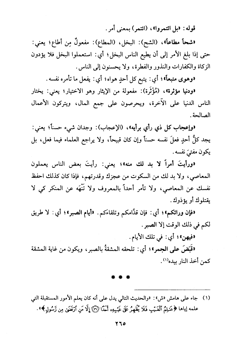 "شحًا مطاعًا"، (الشح): البخل، (المطاع): مفعولٌ مِن أطاع؛ يعني: حتى إذا بلغ الأمر إلى أن يطيع الناس البخل؛ أي: استعملوا البخل فلا يؤدون الزكاة والكفارات والنذور والفطرة، ولا يحسنون إلى الناس.