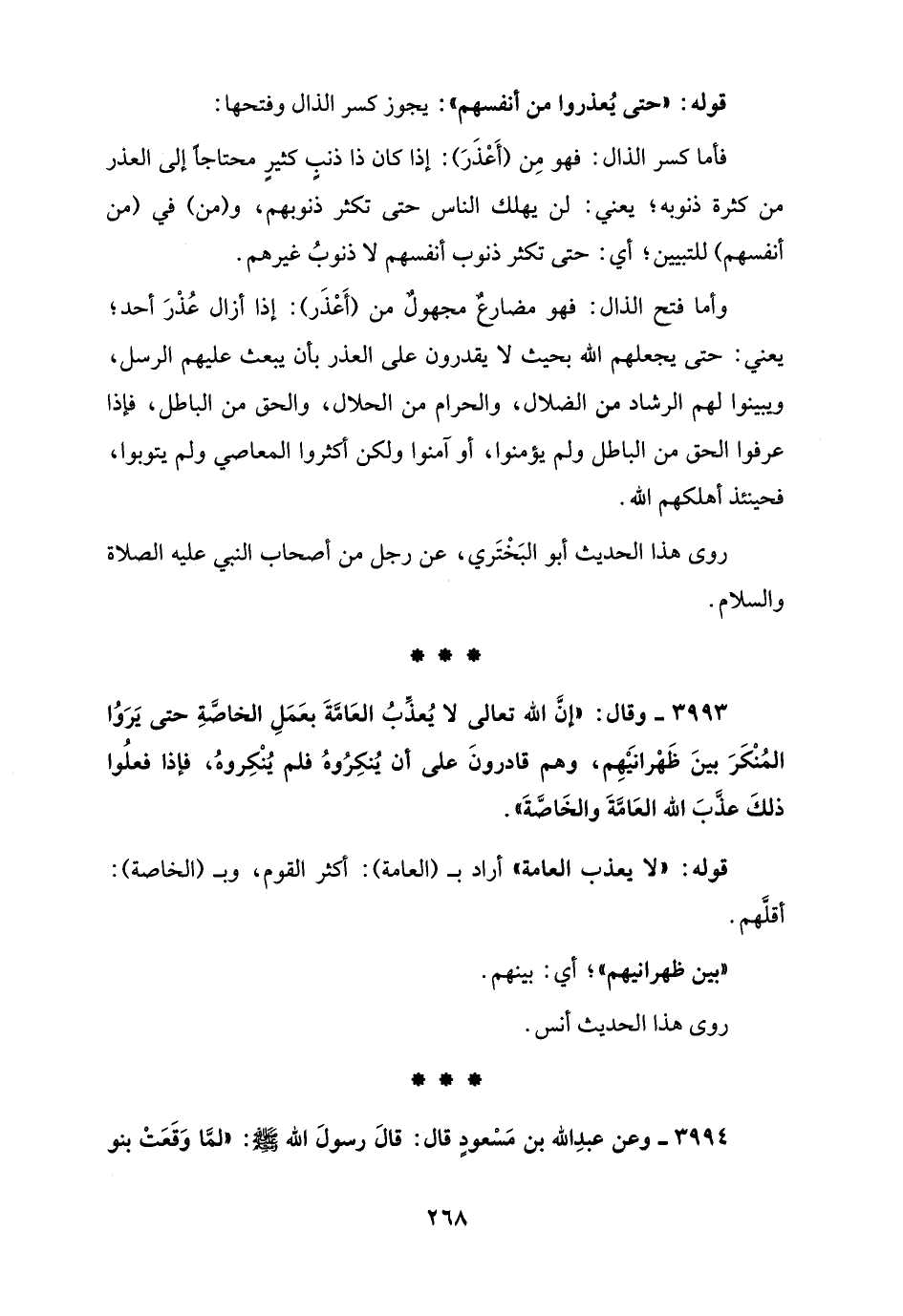 3993 - وقال: "إنَّ الله تعالى لا يُعذِّبُ العَامَّةَ بعَمَلِ الخاصَّةِ حتى يَرَوُا المُنْكَرَ بينَ ظَهْرانَيْهِم، وهم قادرونَ على أن يُنكِرُوهُ فلم يُنْكِروهُ، فإذا فعلُوا ذلكَ عذَّبَ الله العَامَّةَ والخَاصَّةَ".