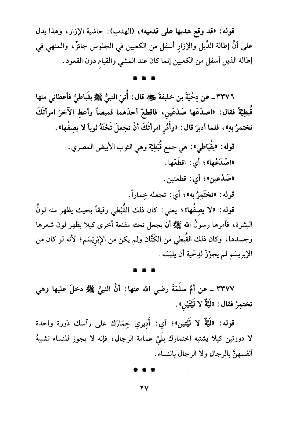 3376 - عن دِحْيَةَ بن خليفةَ - رضي الله عنه - قال: أُتيَ النبيُّ - صلى الله عليه وسلم - بقَباطيَّ فأعطاني منها قُبطِيَّةً فقال: "اصدَعْها صَدْعَينِ، فاقطعْ أحدَهما قميصًا وأعطِ الآخرَ امرأتَكَ تختمرُ بهِ"، فلما أدبرَ قال: "وأْمُرِ امرأتَكَ أنْ تجعلَ تَحْتَهُ ثوبًا لا يصِفُها".