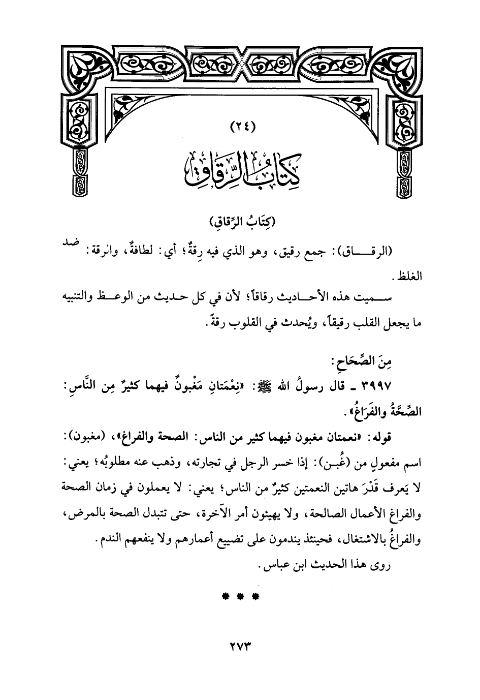 3997 - قال رسولُ الله - صلى الله عليه وسلم -: "نِعْمَتانِ مَغْبونٌ فيهما كثيرٌ مِن النَّاسِ: الصِّحَّةُ والفَرَاغُ".