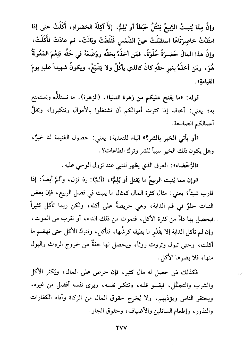 "وإن مما يُنبت الربيعُ ما يَقتل أو يُلِمُّ"، (ألمَّ): إذا نزل، وألمَّ أيضًا: إذا قارب شيئًا؛ يعني: مثال كثرة المال كمثال ما ينبت في فصل الربيع، فإن بعض النبات حلوٌ في فم الدابة، وهي حريصةٌ على أكله، ولكن ربما تأكل كثيرًا فيحصل بها داءٌ من كثرة الأكل، فتموت من ذلك الداء، أو تقرب من الموت، وإن لم تأكل الدابة إلا بقَدْرِ ما يطيقه كرشُها، فتأكل، وتترك الأكل حتى تهضم ما أكلت، وحتى تبول وتروث روثًا، ويحصل لها خفةٌ من خروج الروث والبول منها، فلا يضرها الأكل.