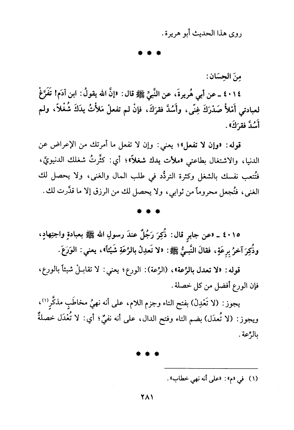 4014 - عن أبي هُريرةَ، عن النَّبيِّ - صلى الله عليه وسلم - قال: "إنَّ الله يقولُ: ابن آدَم! تَفَرَّغْ لعبادتي أَمْلأْ صَدْرَكَ غِنًى، وأَسُدَّ فقرَكَ، فإنْ لم تفعلْ مَلأْتُ يدَكَ شُغْلاً، ولم أَسُدَّ فقرَكَ".