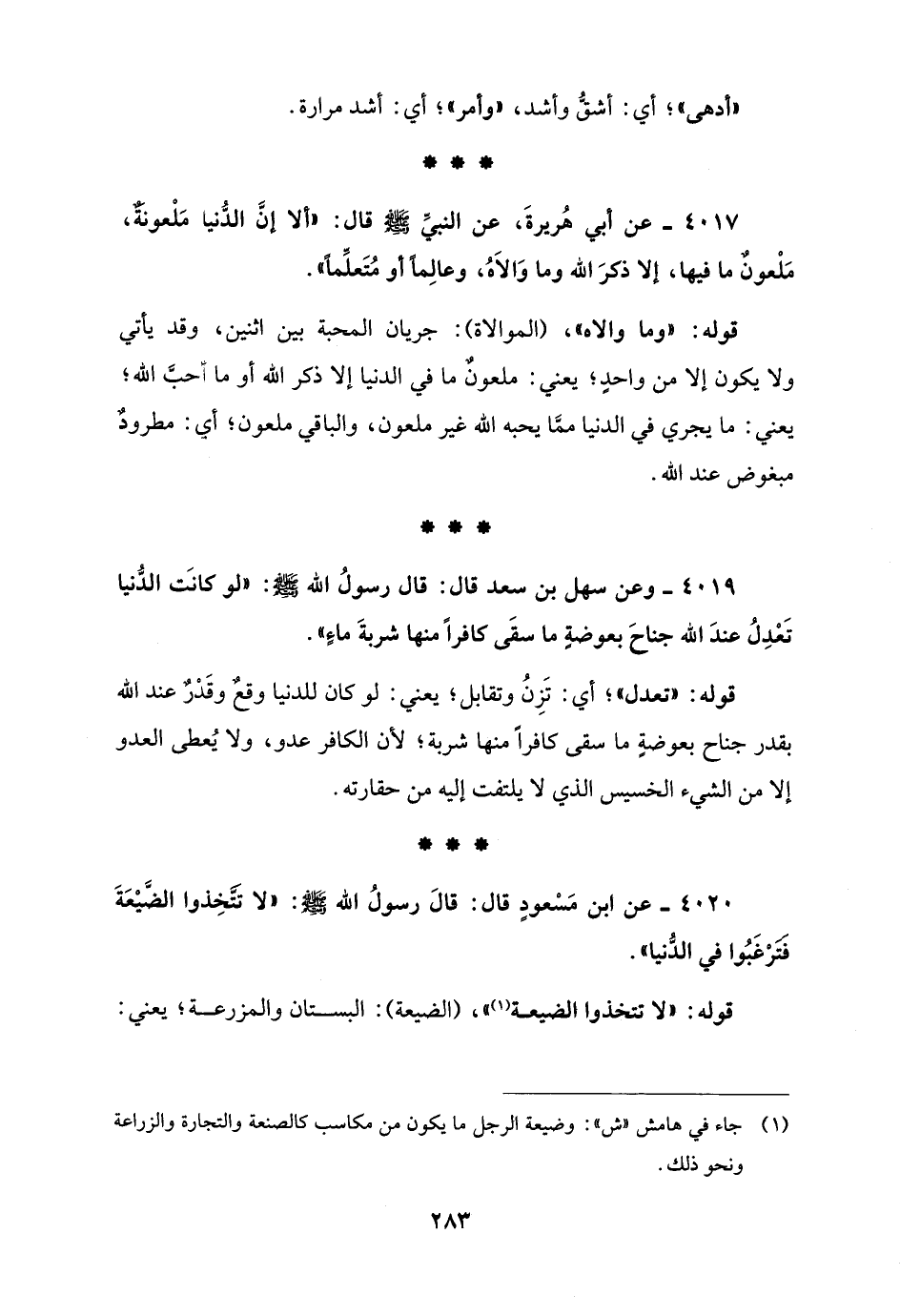 4020 - عن ابن مَسْعودٍ قال: قالَ رسولُ الله - صلى الله عليه وسلم -: "لا تَتَّخِذوا الضَّيْعَةَ فَتَرْغَبُوا في الدُّنيا".