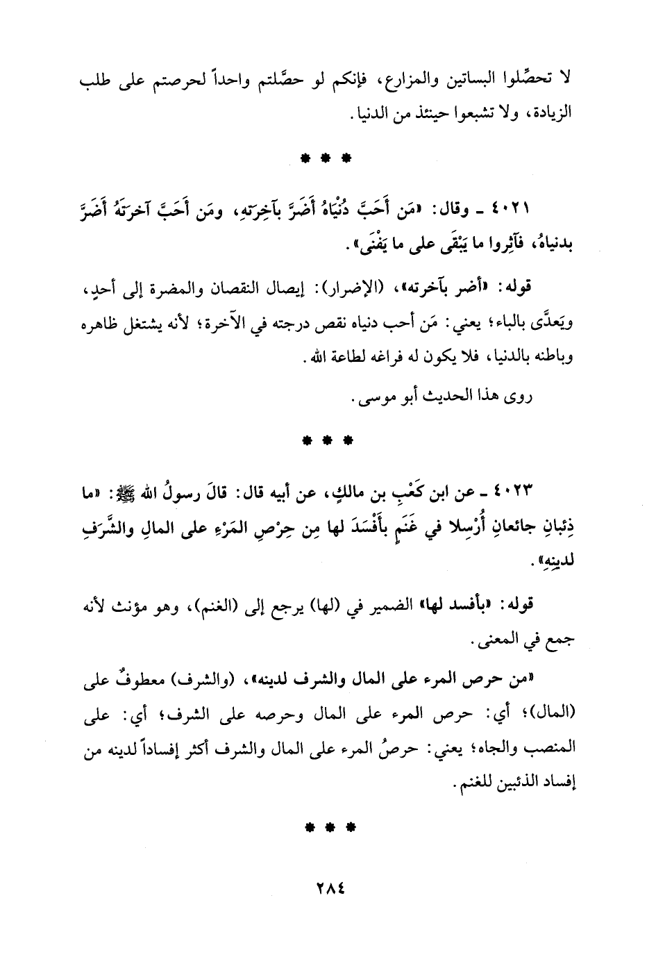 4023 - عن ابن كَعْبِ بن مالكٍ، عن أبيه قال: قالَ رسولُ الله - صلى الله عليه وسلم -: "ما ذِئبانِ جائعانِ أُرْسِلا في غَنَمٍ بأَفْسَدَ لها مِن حِرْصِ المَرْءِ على المالِ والشَّرَفِ لدينِهِ".