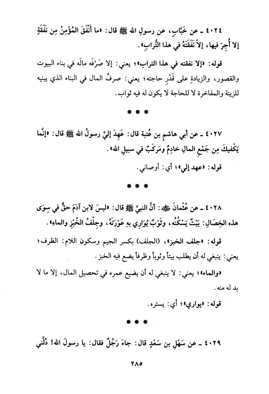 4027 - عن أبي هاشم بن عُتبة قال: عَهِدَ إليَّ رسولُ الله - صلى الله عليه وسلم - قال: "إنَّما يَكْفيكَ مِن جَمْعِ المالِ خادِمٌ ومَركَبٌ في سبيلِ الله".