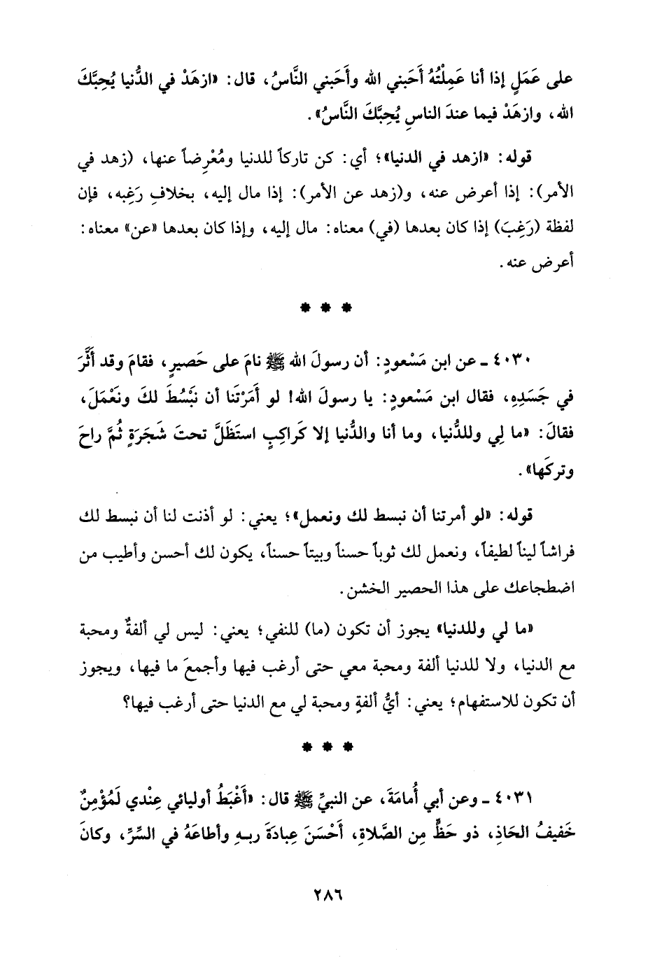 4030 - عن ابن مَسْعودٍ: أن رسولَ الله - صلى الله عليه وسلم - نامَ على حَصيرٍ، فقامَ وقد أَثَّرَ في جَسَدِهِ، فقال ابن مَسْعودٍ: يا رسولَ الله! لو أَمَرْتَنا أن نَبْسُطَ لكَ ونَعْمَلَ، فقالَ: "ما لِي وللدُّنيا، وما أنا والدُّنيا إلا كَراكِبٍ استَظَلَّ تحتَ شَجَرَةٍ ثُمَّ راحَ وتركَها".