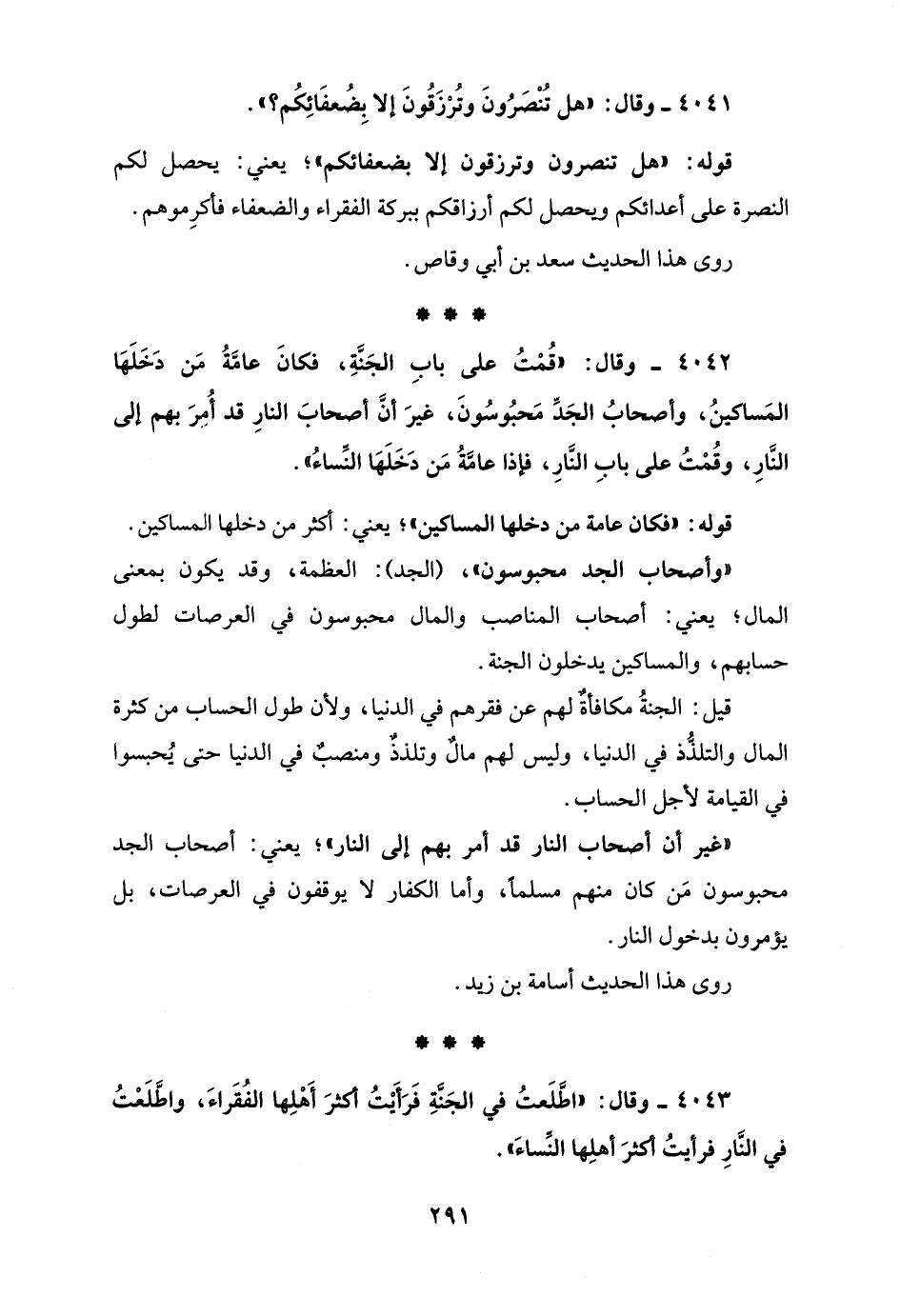4042 - وقال: "قُمْتُ على بابِ الجَنَّةِ، فكانَ عامَّةُ مَن دَخَلَهَا المَساكينُ، وأصحابُ الجَدِّ مَحبُوسُونَ، غيرَ أنَّ أصحابَ النارِ قد أُمِرَ بهم إلى النَّارِ، وقُمْتُ على بابِ النَّارِ، فإذا عامَّةُ مَن دَخَلَهَا النِّساءُ".