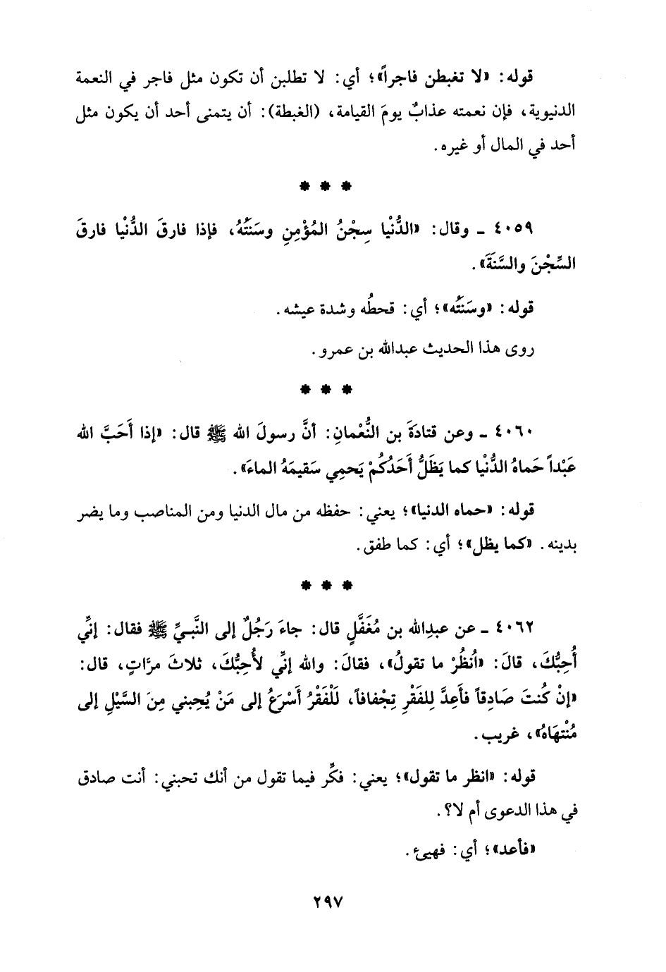 4062 - عن عبدِ الله بن مُغَفَّلٍ قال: جاءَ رَجُلٌ إلى النَّبيِّ - صلى الله عليه وسلم - فقال: إِنِّي أُحِبُّكَ، قالَ: "اُنظُرْ ما تقولُ"، فقالَ: والله إنِّي لأُحِبُّكَ، ثلاثَ مرَّاتٍ، قال: "إنْ كُنتَ صَادِقًا فأَعِدَّ لِلفَقْرِ تِجْفافًا، لَلْفَقْرُ أَسْرعُ إلى مَنْ يُحِبني مِنَ السَّيْلِ إلى مُنْتهَاهُ"، غريب.