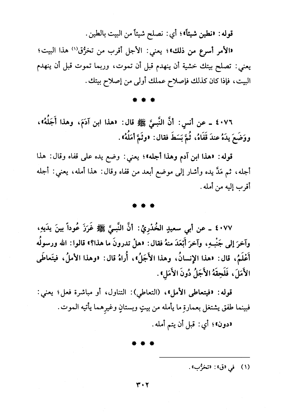 4077 - عن أبي سعيدٍ الخُدْرِيِّ: أنَّ النَّبيَّ - صلى الله عليه وسلم - غَرَزَ عُودًا بينَ يدَيهِ، وآخرَ إلى جَنْبهِ، وآخرَ أَبْعَدَ منهُ فقال: "هلْ تدرونَ ما هذا؟ " قالوا: الله ورسولُه أَعْلَمُ، قال: "هذا الإنسانُ، وهذا الأَجَلُ"، أُراهُ قال: "وهذا الأملُ، فيتَعاطَى الأَمَلَ، فَلَحِقَهُ الأَجَلُ دُونَ الأَمَلِ".