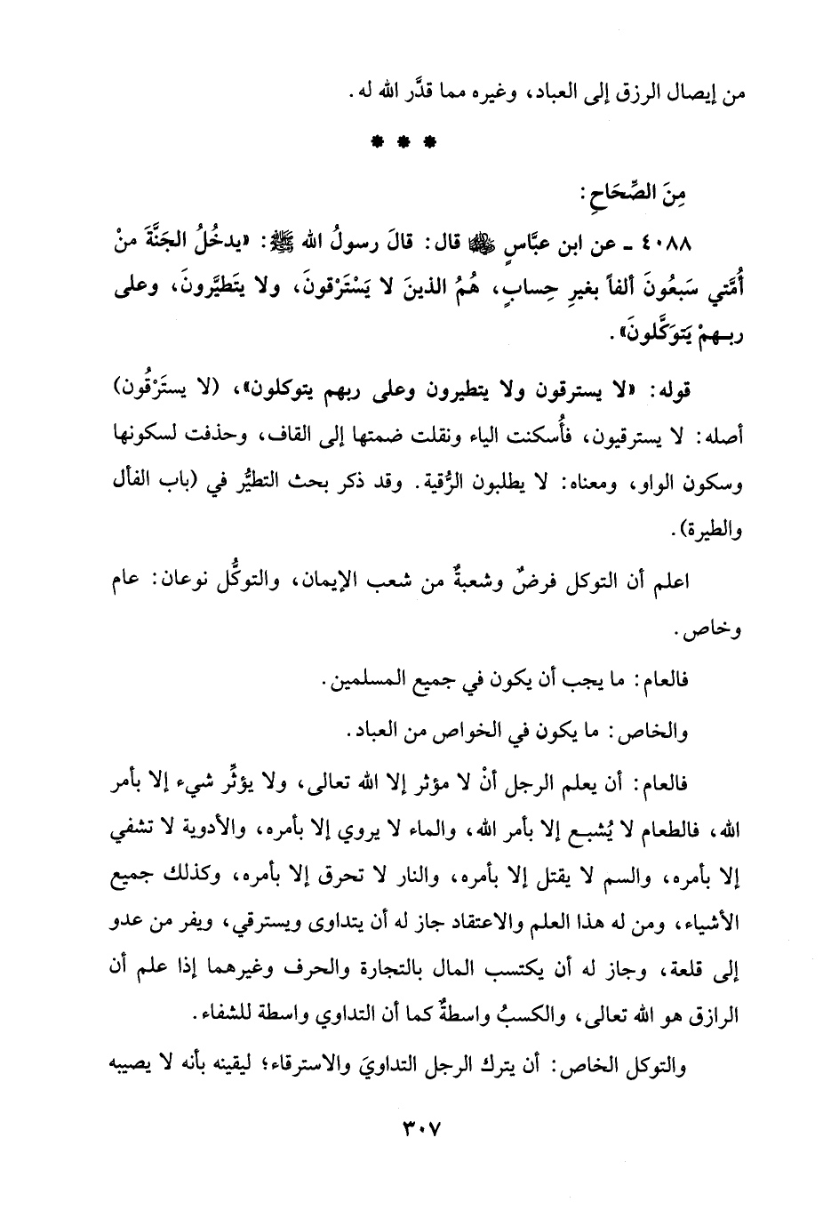 4088 - عن ابن عبَّاسٍ - رضي الله عنهما - قال: قالَ رسولُ الله - صلى الله عليه وسلم -: "يدخُلُ الجَنَّةَ منْ أُمَّتي سَبعُونَ ألفًا بغيرِ حِسابٍ، هُمُ الذينَ لا يَسْتَرْقونَ، ولا يتَطيَّرونَ، وعلى ربهمْ يَتوَكَّلونَ".