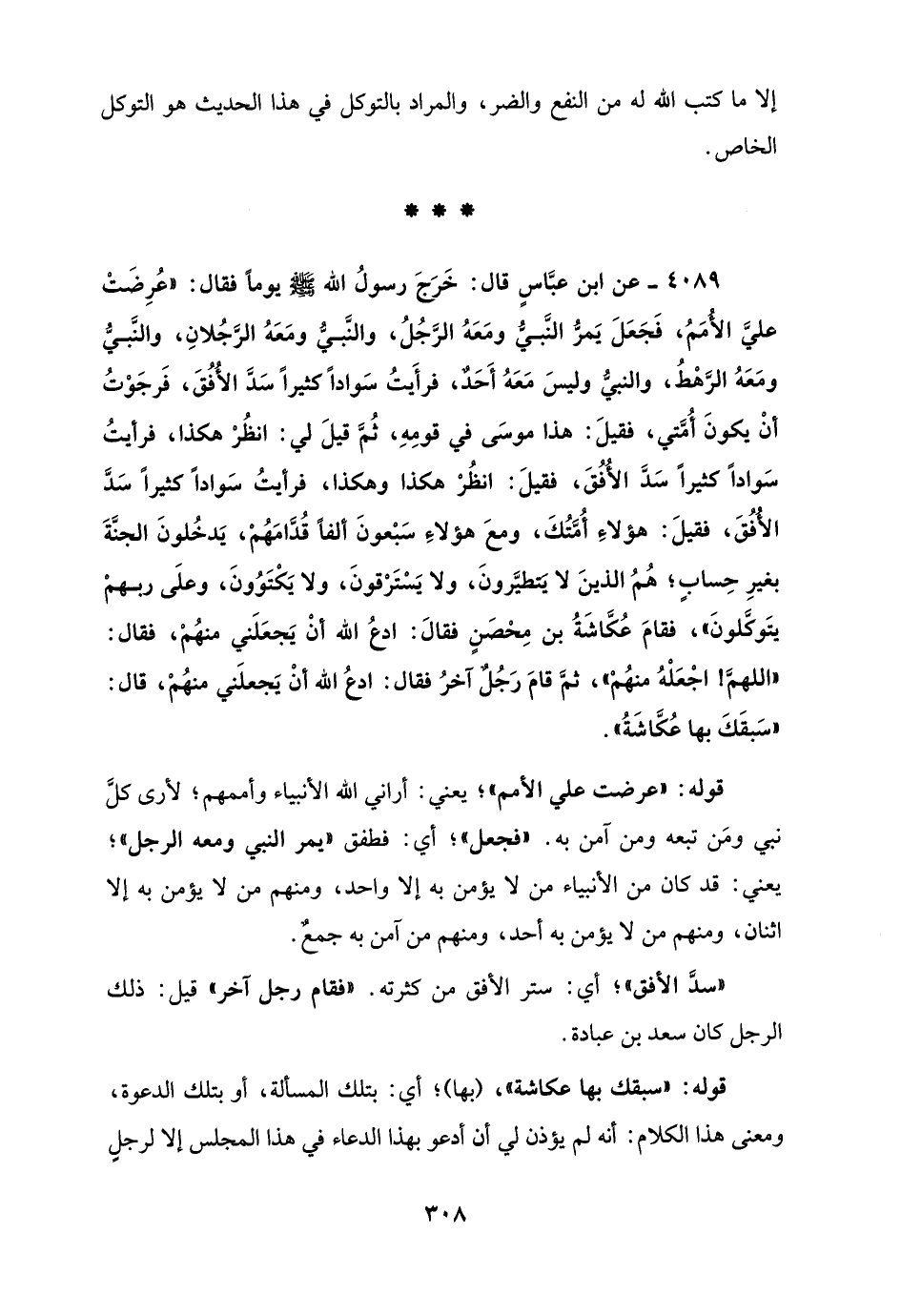 4089 - عن ابن عبَّاسٍ قال: خَرَجَ رسولُ الله - صلى الله عليه وسلم - يومًا فقال: "عُرِضَتْ عليَّ الأُمَمُ، فَجَعَلَ يَمرُّ النبي ومَعَهُ الرَّجُلُ، والنَّبيُّ ومَعَهُ الرَّجُلانِ، والنَّبيُّ ومَعَهُ الرَّهْطُ، والنبيُّ وليسَ مَعَهُ أَحَدٌ، فرأَيتُ سَوادًا كثيرًا سَدَّ الأُفُقَ، فَرجَوْتُ أنْ يكونَ أُمَّتي، فقيلَ: هذا موسَى في قومِهِ، ثُمَّ قيلَ لي: انظُرْ هكذا، فرأيتُ سَوادًا كثيرًا سَدَّ الأُفُقَ، فقيلَ: انظُرْ هكذا وهكذا، فرأيتُ سَوادًا كثيرًا سَدَّ الأُفُقَ، فقيلَ: هؤلاءِ أُمَّتُكَ، ومعَ هؤلاءِ سَبْعونَ ألفًا قُدَّامَهُمْ، يَدخُلونَ الجنَّةَ بغيرِ حِسابٍ؛ هُمُ الذينَ لا يَتطيَّرونَ، ولا يَسْتَرْقونَ، ولا يَكْتَوُونَ، وعلَى ربهمْ يتَوكَّلونَ"، فقامَ عُكَّاشَةُ بن مِحْصَنٍ فقالَ: ادعُ الله أنْ يَجعَلَني منهُمْ، فقال: "اللهمَّ! اجْعَلْهُ منهُمْ"، ثمَّ قامَ رَجُلٌ آخرُ فقال: ادعُ الله أنْ يَجعلَني منهُمْ، قال: "سَبقَكَ بها عُكَّاشَةُ".