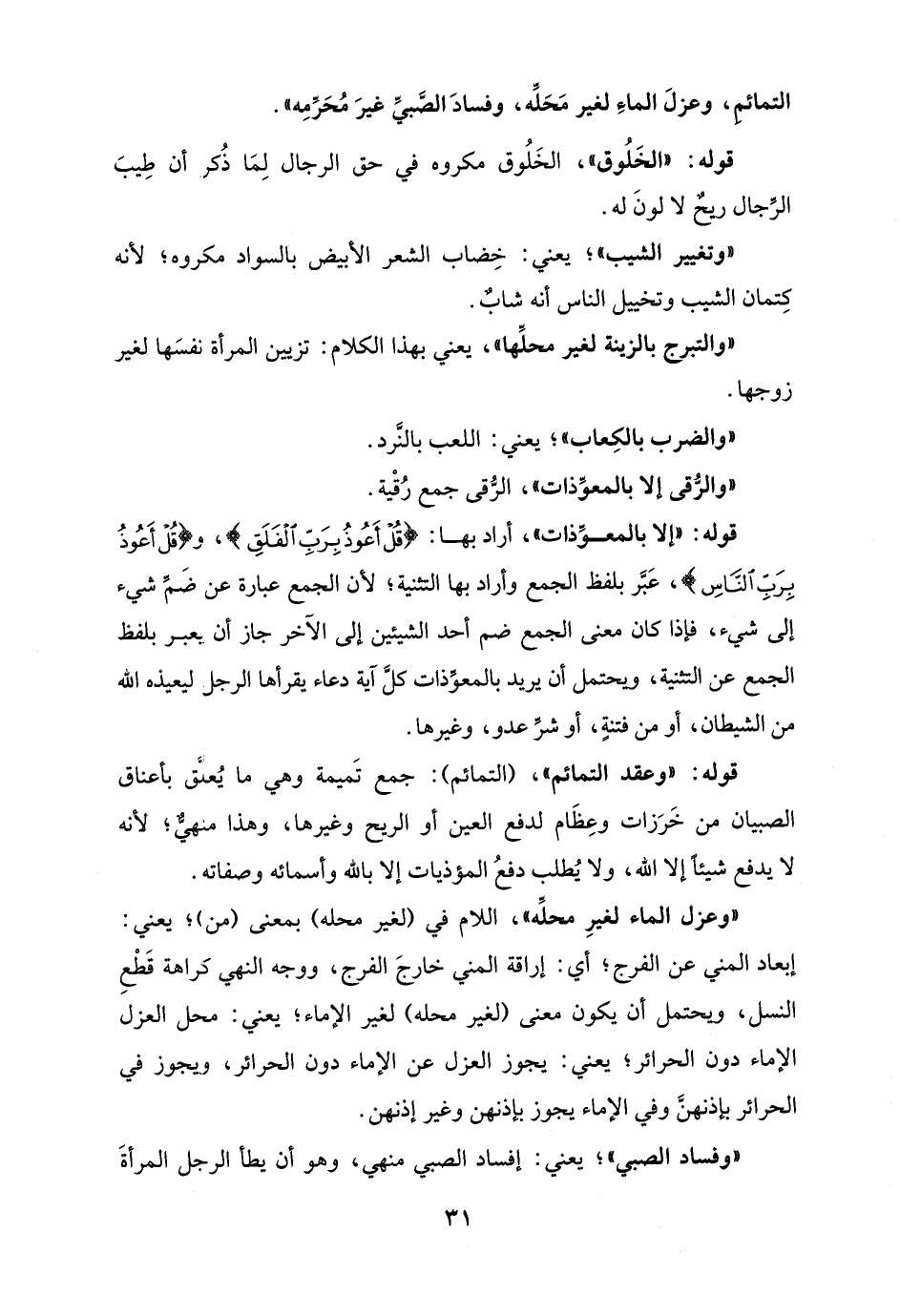 التمائمِ، وعزلَ الماء لغير مَحَلِّه، وفسادَ الصَّبيِّ غيرَ مُحَرِّمِه".