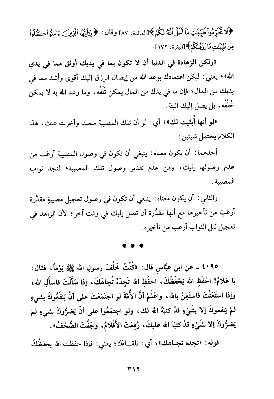 4095 - عن ابن عبَّاسٍ قال: "كُنْتُ خَلْفَ رسولِ الله - صلى الله عليه وسلم - يَوْمًا، فقال: يا غلامُ! احْفَظِ الله يَحْفَظْكَ، احفَظِ الله تَجِدْهُ تُجاهَكَ، إذا سَأَلْتَ فاسأَلِ الله، وإذا استَعَنْتَ فاستَعِنْ بالله، واعْلَمْ أنَّ الأُمَّةَ لو اجتَمَعَتْ على أنْ يَنفَعُوكَ بشيءٍ لمْ يَنفعوكَ إلا بشَيْءٍ قدْ كتبَهُ الله لك، ولو اجتمَعُوا على أنْ يَضرُّوكَ بشيءٍ لمْ يَضرُّوكَ إلا بشَيْءٍ قدْ كتبَهُ الله عليكَ، رُفِعَتْ الأَقْلامُ، وجَفَّتْ الصُّحُفُ".
