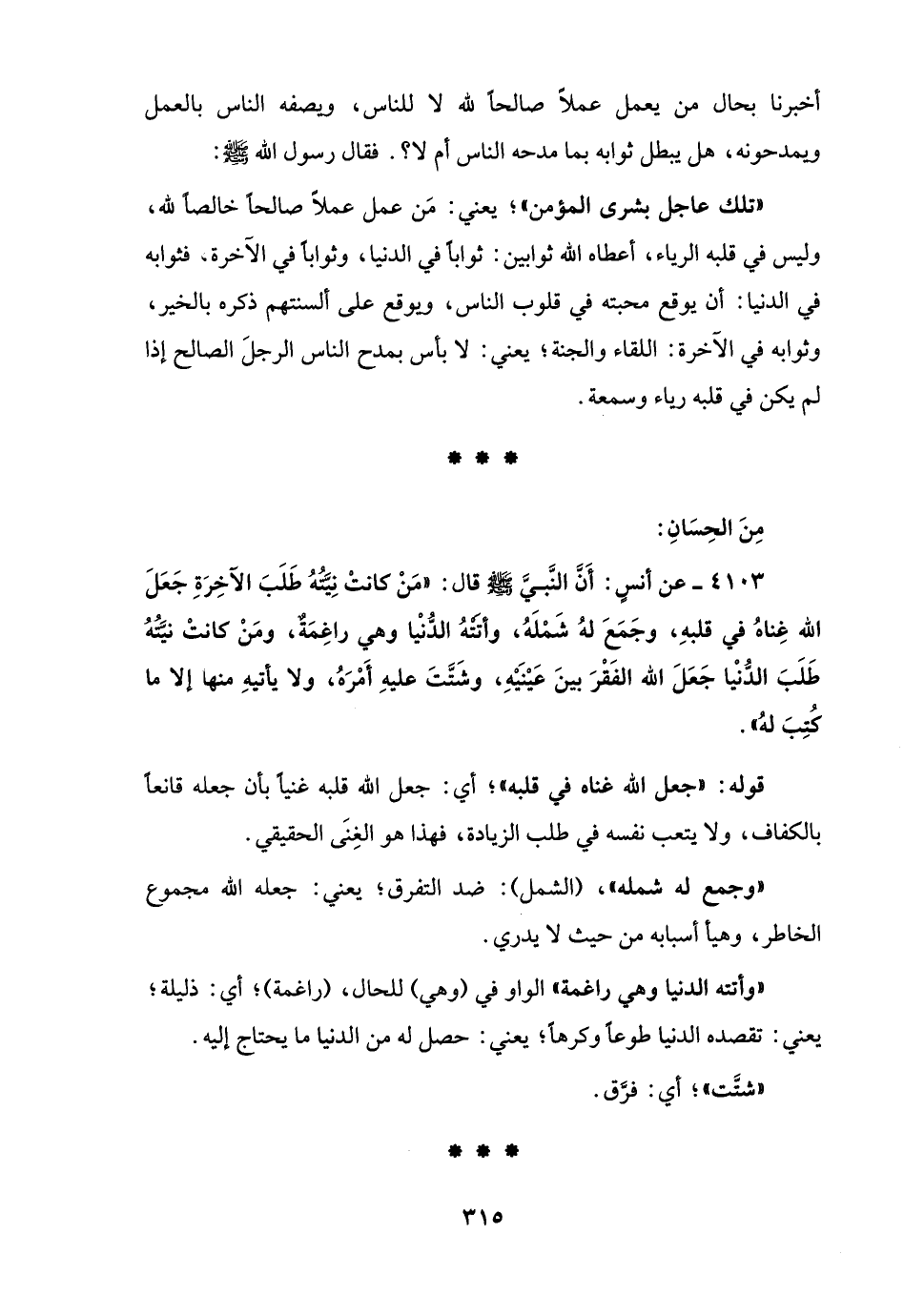 4103 - عن أنسٍ: أَنَّ النَّبيَّ - صلى الله عليه وسلم - قال: "مَنْ كانتْ نِيَّتُهُ طَلَبَ الآخِرَةِ جَعَلَ الله غِناهُ في قلبهِ، وجَمَعَ لهُ شَمْلَهُ، وأتَتْهُ الدُّنْيا وهي راغِمَةٌ، ومَنْ كانتْ نيَّتُهُ طَلَبَ الدُّنْيا جَعَلَ الله الفَقْرَ بينَ عَيْنَيْهِ، وشَتَّتَ عليهِ أَمْرَهُ، ولا يأتيهِ منها إلا ما كُتِبَ لهُ".