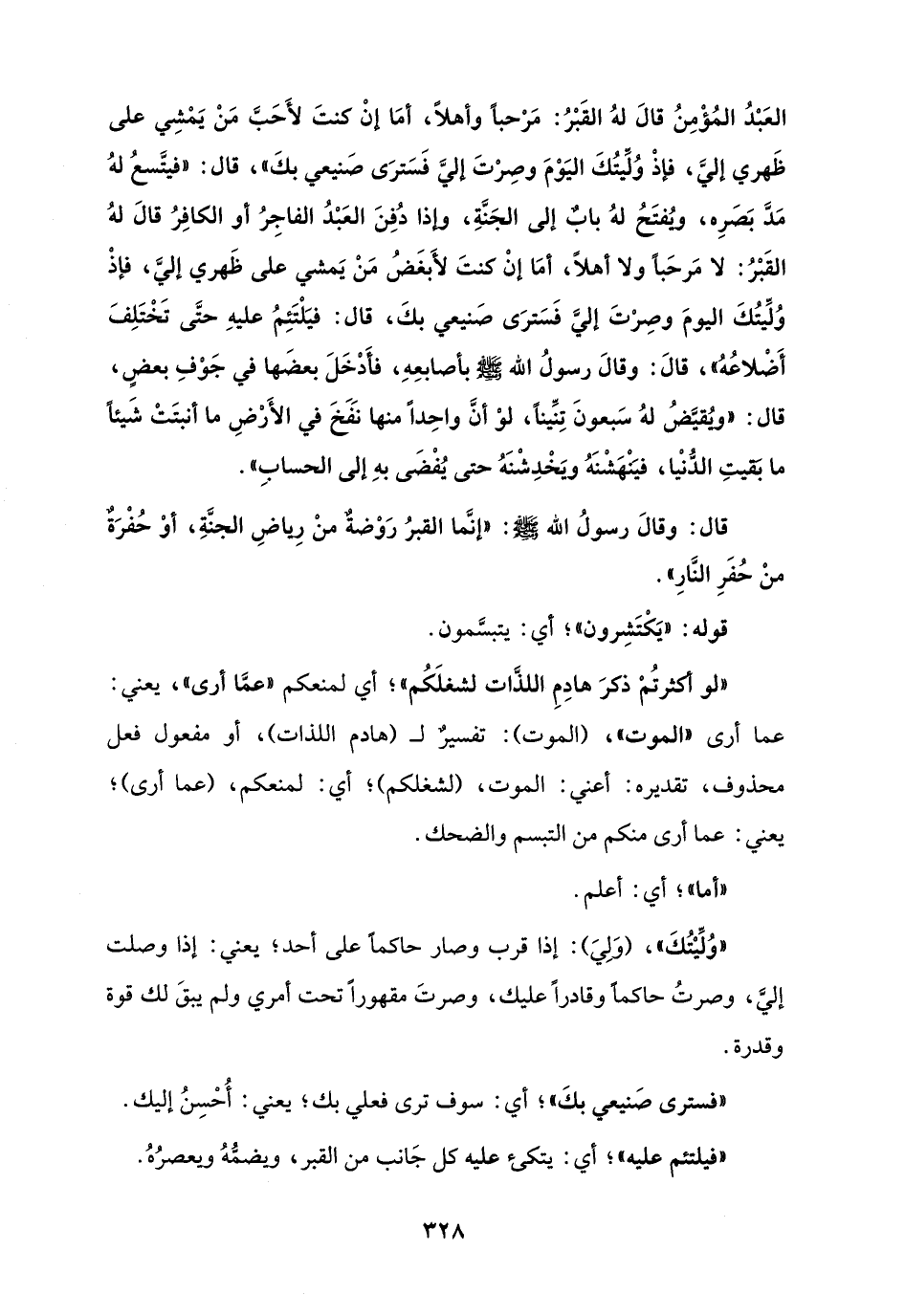 العَبْدُ المُؤْمِنُ قالَ لهُ القَبْرُ: مَرْحبًا وأهلًا، أمَا إنْ كنتَ لأَحَبَّ مَنْ يَمْشِي على ظَهري إليَّ، فإذْ وُلِّيتُكَ اليَوْمَ وصِرْتَ إليَّ فَسَترَى صَنيعي بكَ"، قال: "فيتَّسعُ لهُ مَدَّ بَصَرِه، ويُفتَحُ لهُ بابٌ إلى الجَنَّةِ، وإذا دُفِنَ العَبْدُ الفاجِرُ أو الكافِرُ قالَ لهُ القَبْرُ: لا مَرحَبًا ولا أهلًا، أمَا إنْ كنتَ لأَبغَضُ مَنْ يَمشي على ظَهري إليَّ، فإذْ وُلِّيتُكَ اليومَ وصِرْتَ إليَّ فَسَترَى صَنيعي بكَ، قال: فيَلْتَئِمُ عليهِ حتَّى تَخْتَلِفَ أَضْلاعُهُ"، قالَ: وقالَ رسولُ الله - صلى الله عليه وسلم - بأصابعِهِ، فأَدْخَلَ بعضَها في جَوْفِ بعضٍ، قال: "ويُقيَّضُ لهُ سَبعونَ تِنِّينًا، لوْ أنَّ واحِدًا منها نَفَخَ في الأَرْضِ ما أنبتَتْ شَيئًا ما بَقيتِ الدُّنْيا، فيَنْهَشْنَهُ ويَخْدِشْنَهُ حتى يُفْضَى بهِ إلى الحسابِ".