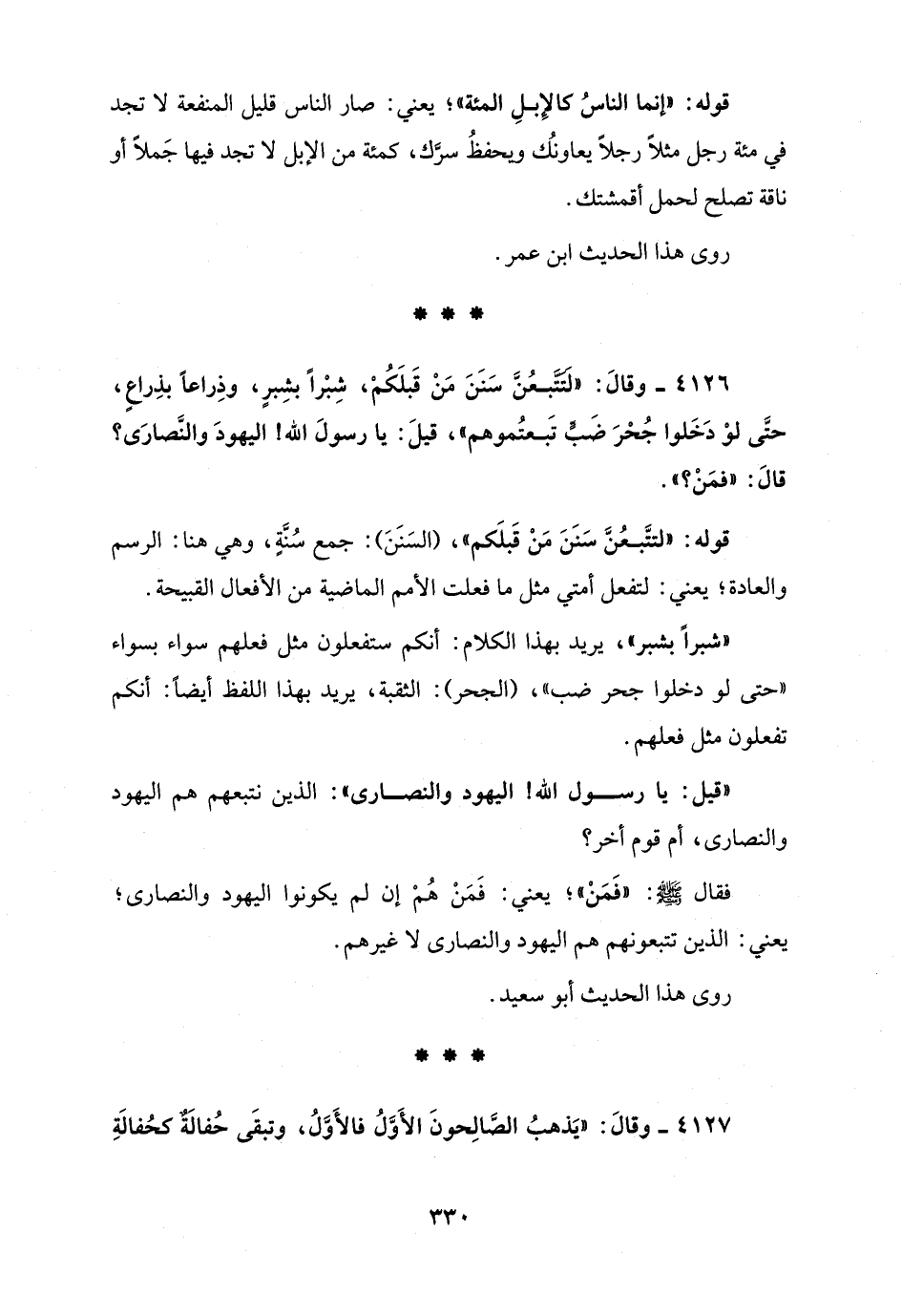 4126 - وقالَ: "لَتَتَّبعُنَّ سَنَنَ مَنْ قَبلَكُمْ، شِبْرًا بشِبرٍ، وذِراعًا بذِراعٍ، حتَّى لوْ دَخَلوا جُحْرَ ضَبٍّ تَبعتُموهم"، قيلَ: يا رسولَ الله! اليهودَ والنَّصارَى؟ قالَ: "فمَنْ؟ ".