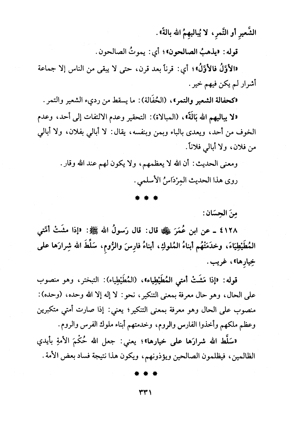 4128 - عن ابن عُمَرَ - رضي الله عنهما - قال: قال رَسولُ الله - صلى الله عليه وسلم -: "إذا مشَتْ أمَّتي المُطَيْطِيَاءَ، وخدَمَتْهُم أبناءُ المُلوكِ، أبناءُ فارِسَ والرُّومِ، سَلِّطَ الله شِرارَها على خِيارِها"، غريب.