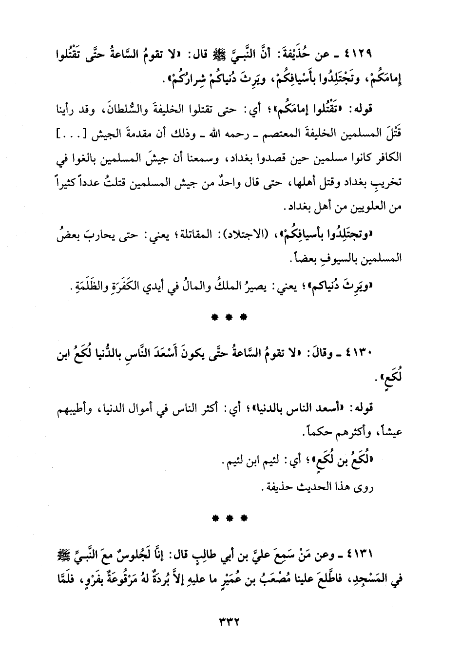 4129 - عن حُذَيْفةَ: أنَّ النَّبيَّ - صلى الله عليه وسلم - قال: "لا تقومُ السَّاعةُ حتَّى تَقْتُلوا إِمامَكُمْ، وتَجْتَلِدُوا بأَسْيافِكُمْ، ويَرِثَ دُنياكُمْ شِرارُكُمْ".