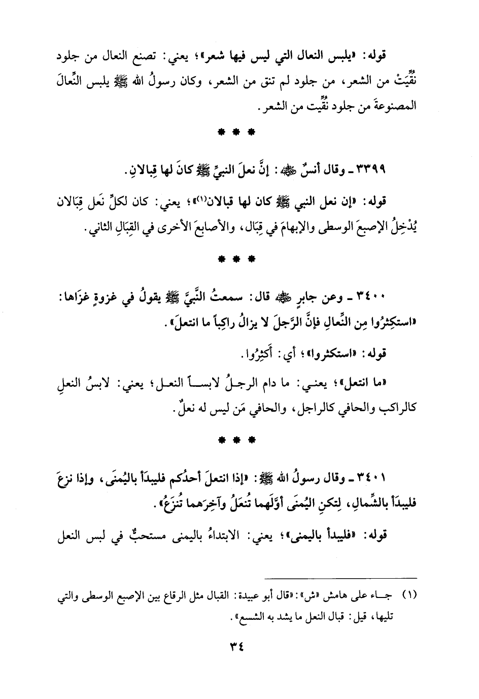 3399 - وقال أنسٌ - رضي الله عنه -: إنَّ نعلَ النبيَّ - صلى الله عليه وسلم - كانَ لها قِبالانِ.