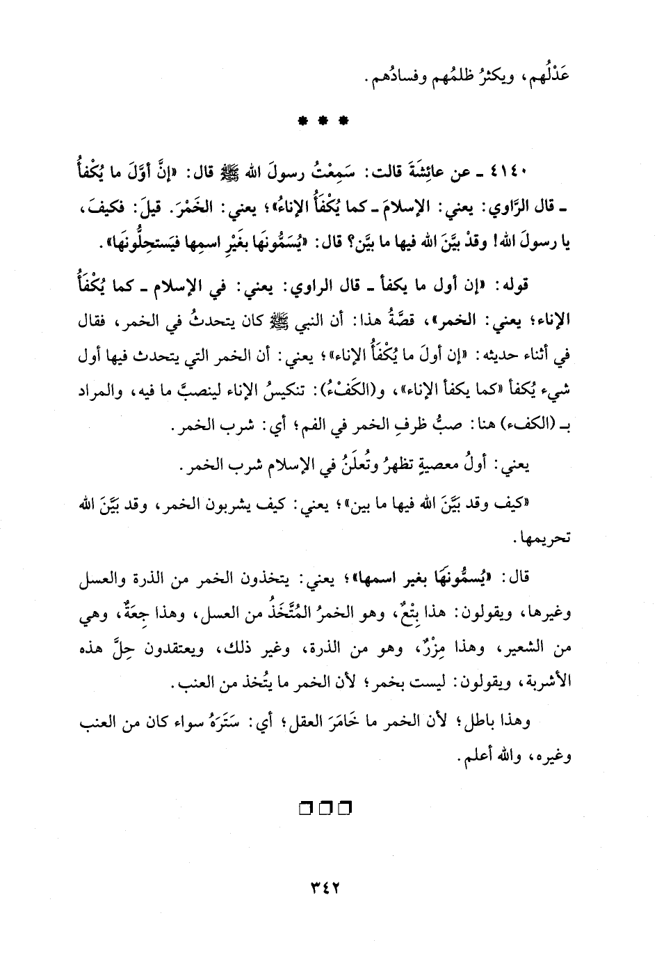 4140 - عن عائِشَةَ قالت: سَمِعْتُ رسولَ الله - صلى الله عليه وسلم - قال: "إنَّ أوَّلَ ما يُكْفأُ - قال الرَّاوي: يعني: الإسلامَ - كما يُكْفَأُ الإناءُ"؛ يعني: الخَمْرَ. قيلَ: فكيفَ، يا رسولَ الله! وقدْ بيَّنَ الله فيها ما بيَّن؟ قال: "يُسَمُّونهَا بغَيْرِ اسمِها فيَستحِلُّونَها".